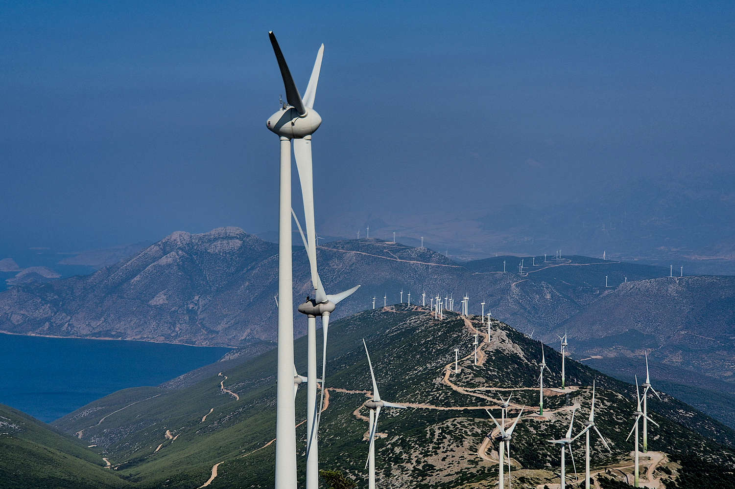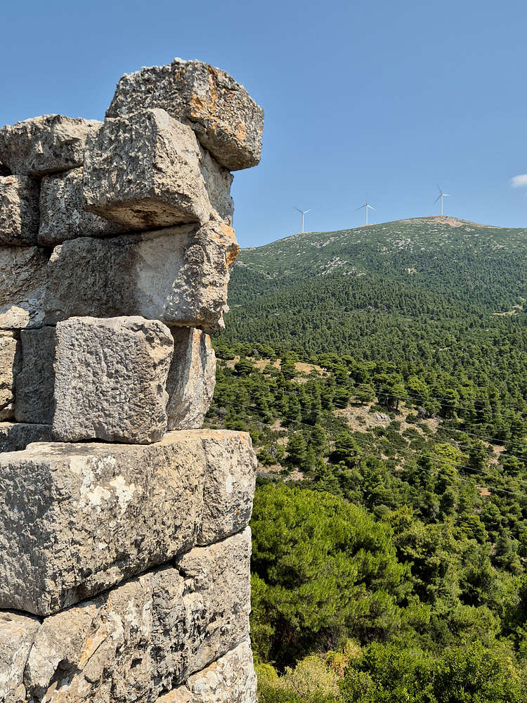The wind-turbines, a modern “fortification”, overlooking the much older Eleutherai Fortress.