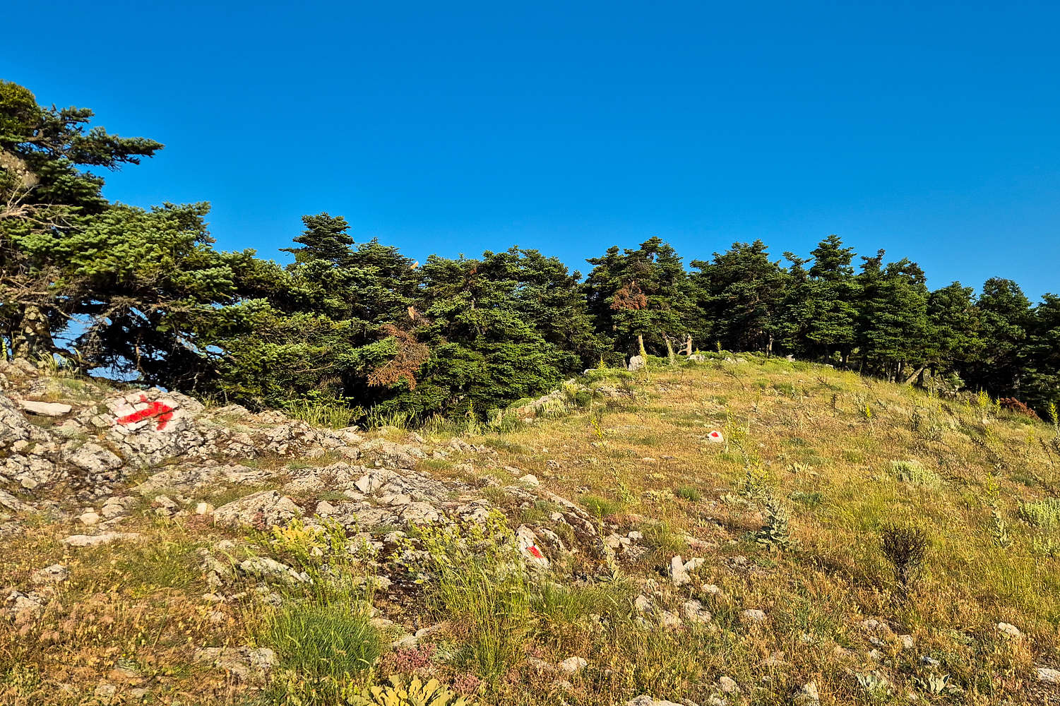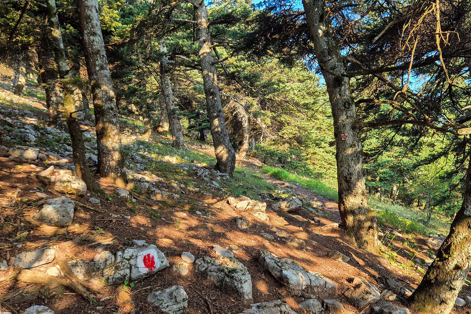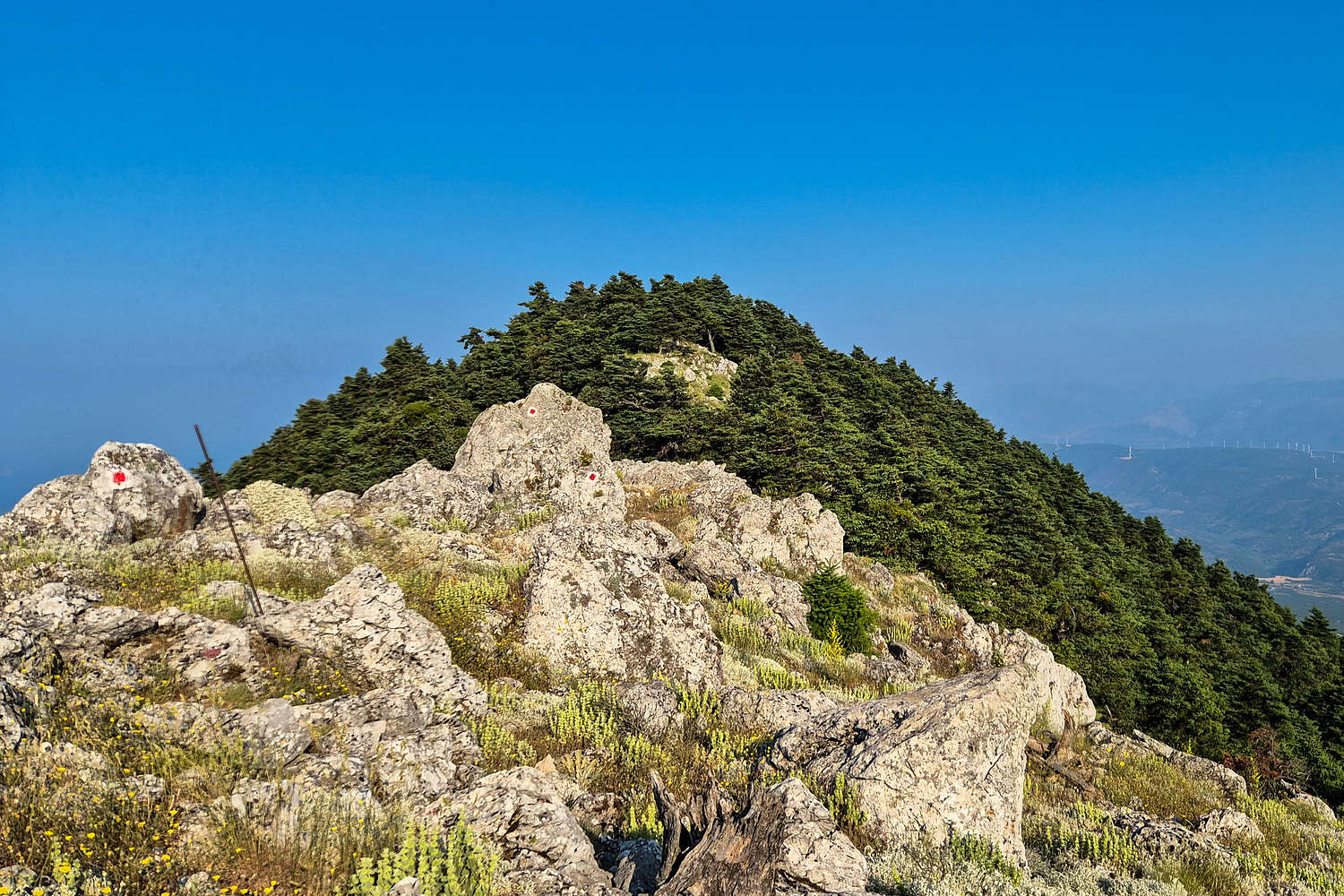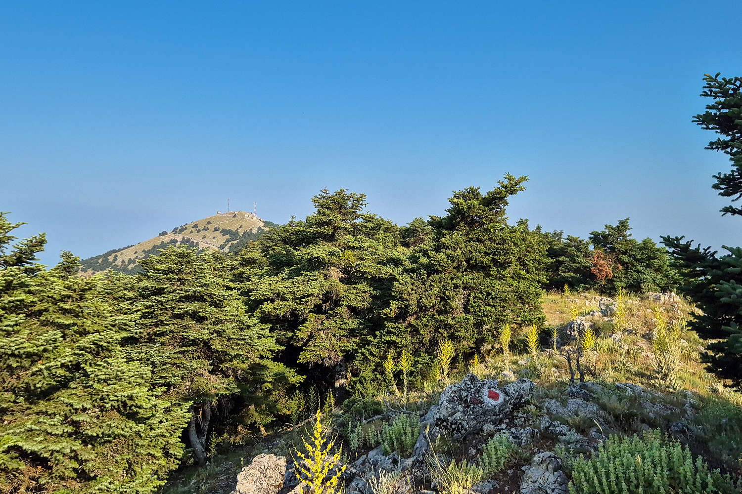 The route begins through a sparse pine forest which provides much needed shade since this section gets hit by the sun early in the day. The track here is very visible and very well marked. The forest ascent section contains about 50% of the overall vertical gain, rising ~240m in the first 30 minutes. Once at the Tries Korufes Intersection & Col. (1,330m) the trail continues on the obvious ridge, however, it is possible to turn left and make a quick ascent of Tries Korufes (1,354m), the massifs Eastmost summit. We opted not to do this on our ascent assuming we would be returning via the same route - we did not.