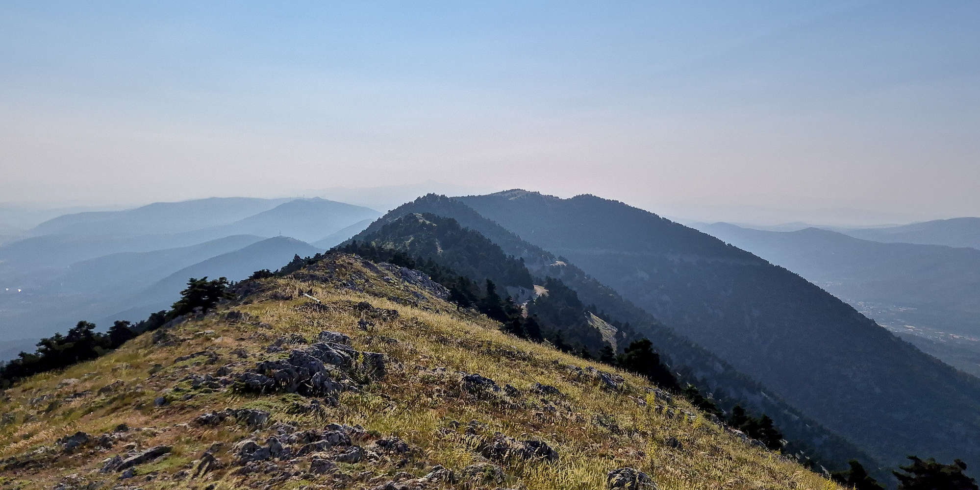 Kithaironas (1,409m) [”Κιθαιρώνας”] is the second highest mountain in the Attica administrative department and features a prominence in excess of 600m (P-827). While generally overlooked, mostly due to it being paved and accessible up to the summit, the classic E → W ridge route offers an enjoyable short outing from Athens with excellent views and interesting terrain. The traditional ‘low-impact’ trailhead for this route is via the Hellenic Mountaineering Club (HMC) of Eleusina Refuge “Vaggelis Tsakos”, located at 1,090m on the Eastern ridge of the main massif. From there just under 400m of elevation gain are required to reach the summit, some 5km away.