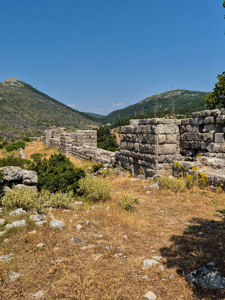 The Fortress of Eleutherai is a defensive outpost built on the southern side of the Kaza Pass (”Πέρασμα Κάζας”) around the 4th century BC, most probably by Thebes, since the Athenian fortified village of Oinoi (”Οινόη“) is nearby. Its outer walls and towers are constructed with cyclopean-type massive limestone blocks probably from Pastra (1,025m) [P-380], Kithairon’s Eastern extension, today covered with wind turbines. The architecture and condition of the defensive system of the N-NE side is still very impressive, and it is one of the very few obvious wall-and-tower fortifications in Greece, especially of that age.