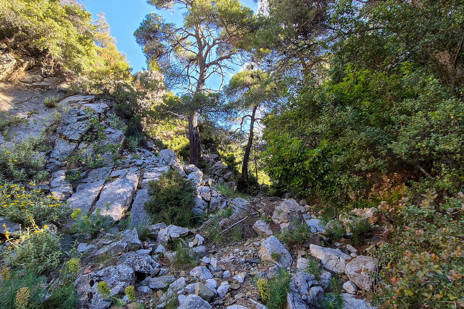 The navigation looking down-slope was extremely difficult with trail tracks abruptly cutting into dense vegetation. The mapped GPX track was of little help, and I resorted in following our ascent route by referring to my GPS every few minutes. The going was most difficult in the upper section where the low laying brush met the larger pine forest below, here detour after detour we progressively made our way down, past the upper and steepest parts of the gully, and onto its slightly inclined “bed”.