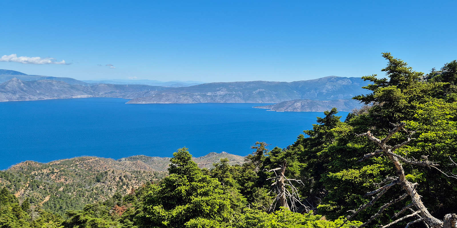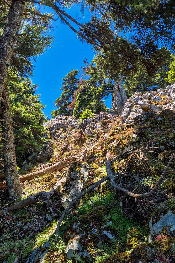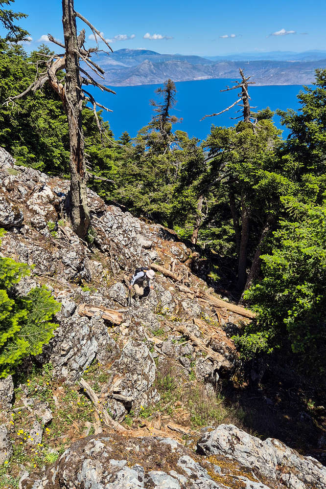 Beginning our ascent of the NW flank we were enveloped in the sparse but beautiful alpine pine forest, rising almost from the sea and into the sky, and protecting us wonderfully from the bright sun of noon. Route finding became increasingly complicated while the lack of a trail on the steep forest scree was a challenge in of itself. Slowly but surely we progressed upwards, eventually gaining the W ridge, but here, where its large limestones meet the main summit cone, a true crux is to be found. Almost 3 hours in, we began ascending a limestone outcropping (Class I-) of about 7m with a clear view into the deep blue of the Halcyon bay below, in complete silence and solitude.