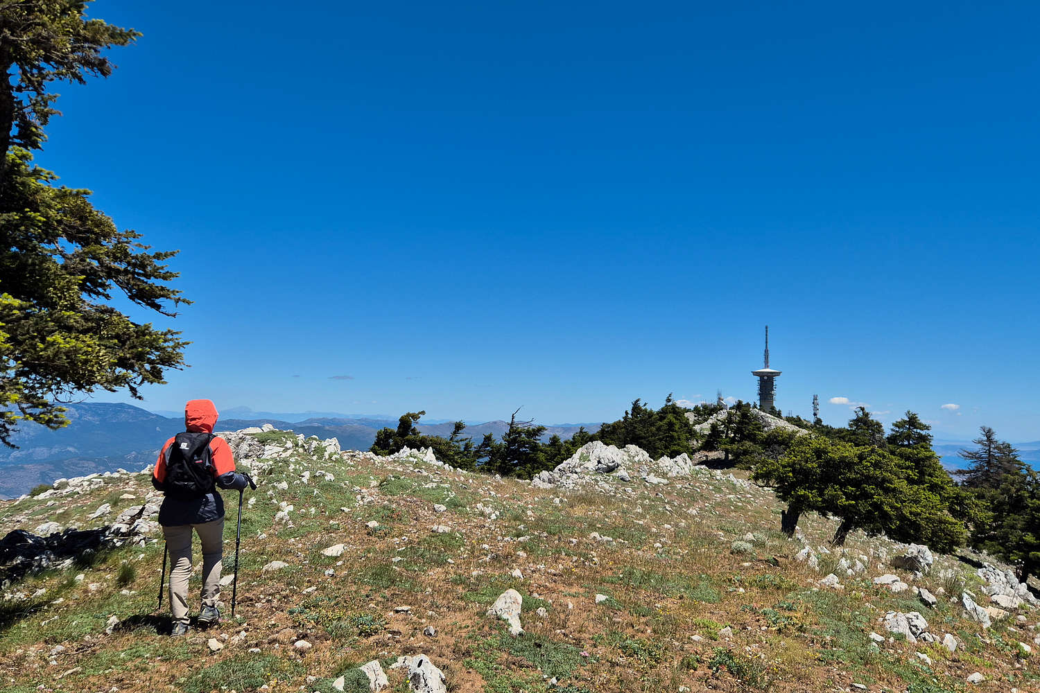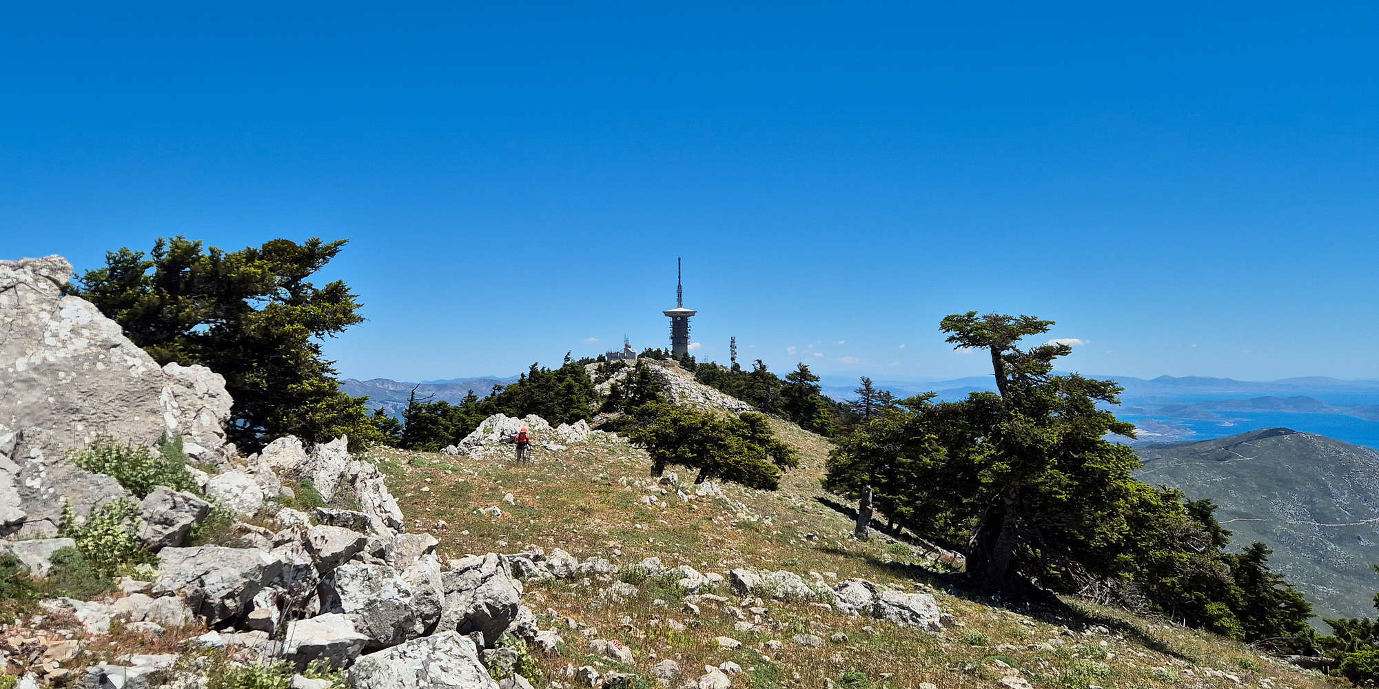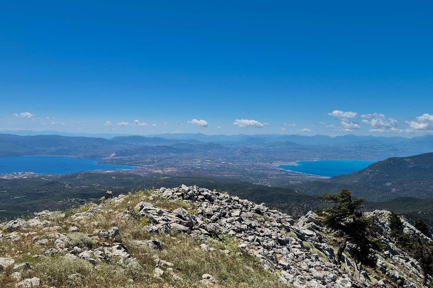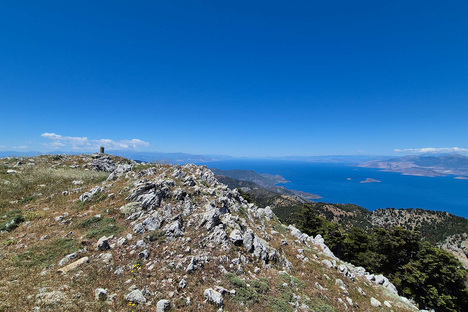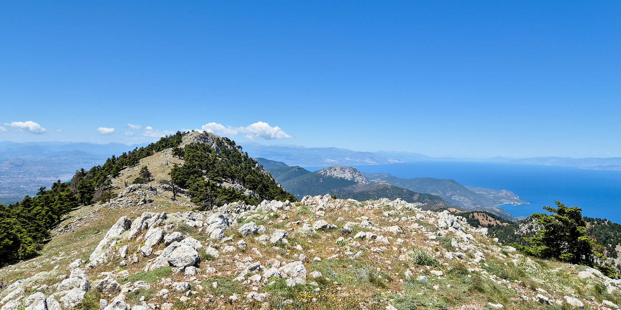 Breaking into the of Makriplagi (1,369m) we were at once again transported into a different realm as the shinning blue sea surrounded >280 degrees of view: the Halcyon Bay, the Corinthian Gulf, and the Saronic Gulf, just an arms reach away. Isn’t prominence a beautiful thing. Up here the forecasted winds finally hit us, and were a welcome feeling under the hot sun of the ridge. With extended views 100s of kilometers away we continued SW through the hilly but manageable ridge. Breaking over the enumerable crests of the ridge the sight never failed to surprise as one had a few more seconds to look around. After 4 hours we finally gained the trig point and the rounded true summit, almost a precipice, dropping steeply into Ntarntiza (650m), where our car was, and highly exposed to winds.