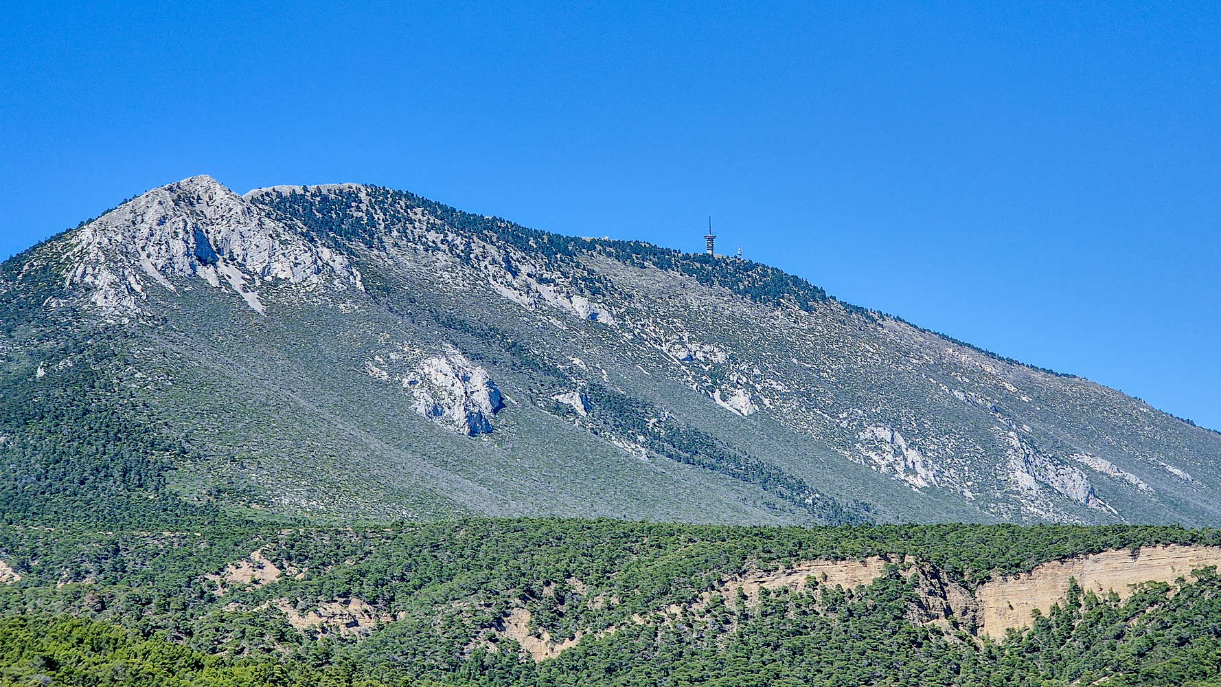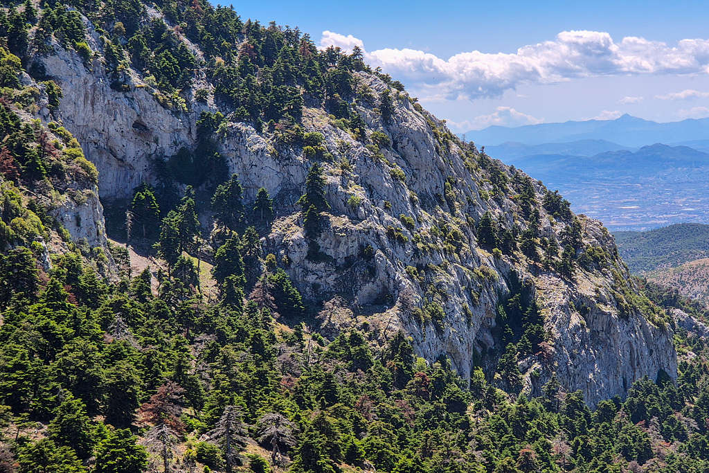 Driving on the swerving narrows of the final paved roads above Ag. Theodoroi, I was amazed to discover a new perspective into this gorgeous mountain. From our vista above the S-SE drainage the mountain’s true size revealed itself in front of us. Lush low-elevation Mediterranean pine and assorted shrubbery spanned tens of kilometers on either direction, no buildings were to be seen, other than the sentinel of a communication tower on the summit, some 1,200m above us. As we dropped into the drainage, following dirt roads to slowly gain elevation, the size and steepness of the Makriplagi (1,369m) massif made itself evident. The pines hung to its slopes from vey low, eventually giving way to darker colors of the temperate pine forest, and above that shining rocks and minuscule shrubs of the alpine. In awe but still under the impression of control we arrived to our trailhead Ntantiza plateau, an amphitheater of incredible volcanic and sedimentary formations at 650m of elevation directly in the heart of the mountain.