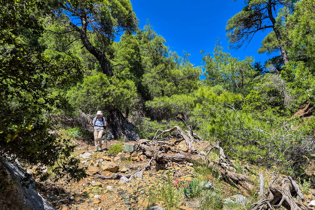 The first few trail markers initially cleared us of any worries of trail quality as we weaved through the dense pines and scattered boulders, although it quickly became obvious that it had been left unmaintained for some time. As we continued trough the narrow gully, slowly gaining elevation our predicament became even clearer as trail marking disappeared, the trail outlines multiplied, and the debris became normal. While we were right on the mapped GPX track the hyper-active geology of the area, that being rapid erosion of the volcanic N slope, and the earthquake activity of the nearby Halcyon Fault, had forced away any type of human infrastructure on this remote slice of the massif. Even the several springs and watering holes were destroyed, simply debris left behind crushed and covered by rocks. After about an hour we broke above the dense vegetation of the gully floor and into the pines above, we walked under gigantic limestone cliffs, unclimbed, with negative angles straight out of a route-setters dream. But navigation here, devoid of any markings and with few ‘goat trails’ quickly became arduous under the morning sun. The usual fallen trees, tight bushes, and large boulders began to slow us down, and like Megaros millennia before us, we raced our way upwards, escaping not but a flood but the clenches of the impassable bush below us.