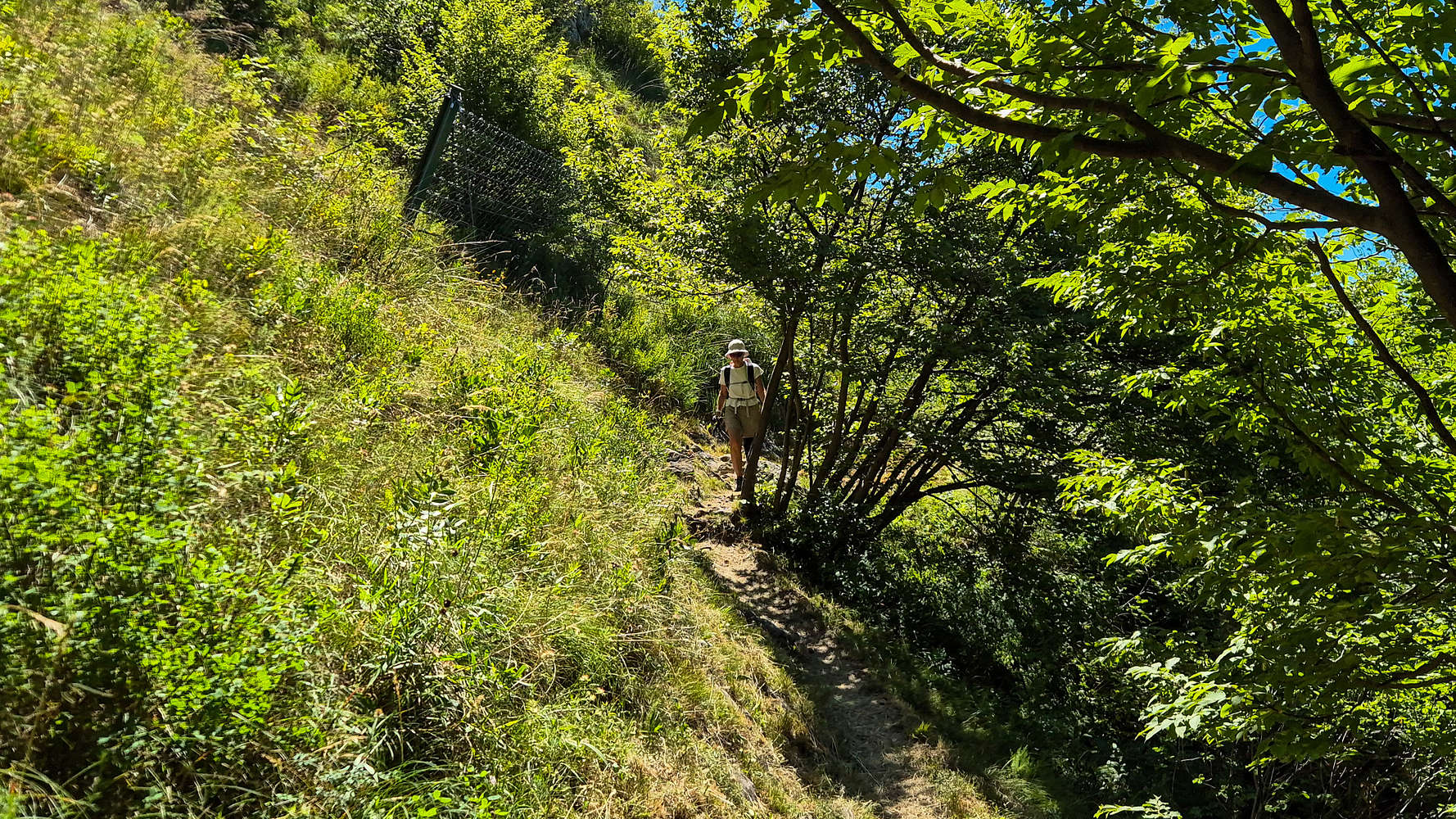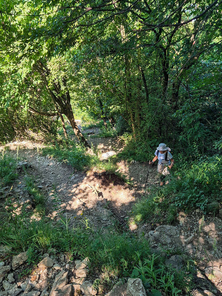 We were the first to leave the summit and followed sparse markings to the S, almost falling in towards the steep Sella della Pila (787m) and Lake Como. The first few minutes inspired a false confidence and probably also inspired another party of young hikers to follow us. Soon we found ourselves above a steep limestone slab, maybe 3m tall at worst, which required a full hanging drop-down to down-climb. After almost throwing my poles into the abyss, I made my way down, only for Terry to point out that it was a “unpleasant & difficult” move, alas she did it just fine. From here the trail quickly smoothed out into well trodden dirt which although steep on the descent was otherwise fine. At this point we wondered about the whereabouts of the other group, who were still downclimbing the outcrop, alas they also succeeded no problem. With the technical aspects behind I bid Terry a quick farewell as I rushed down to Sella della Pila (787m) with the goal of asending the minor second summit of Monte San Michele or I Corno at 815m.