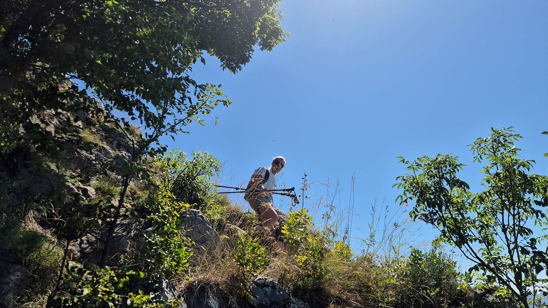 Admittedly I went a little too fast, slipping and eating shit twice on the trail to the col, but gained elevation towards Monte San Michele (815m) [P-28] very quickly. This gave me enough time to take a few photos with leisure, as well as catching both Terry and the other party in action — as visible in the photo. At the same time I was able to quickly return back down to Pila Col. (787m) without leaving Terry to bake in the sun for long.