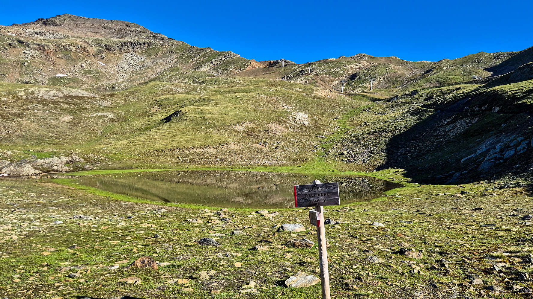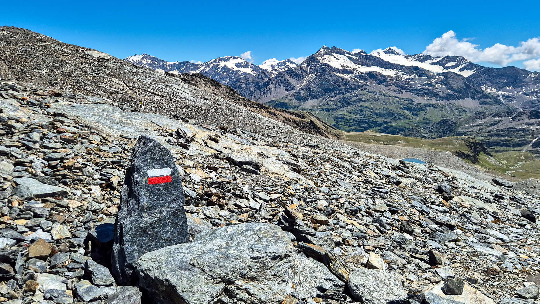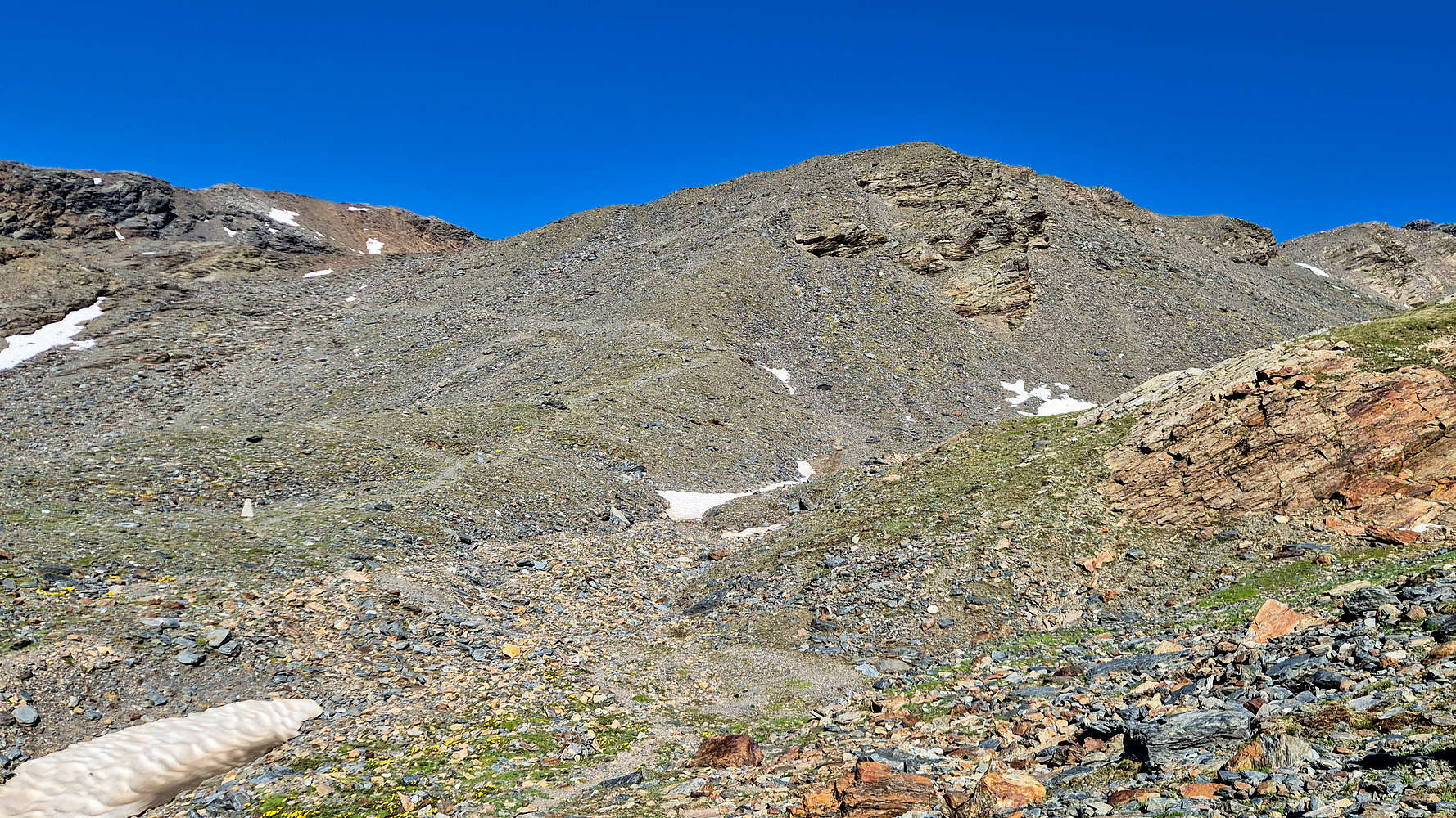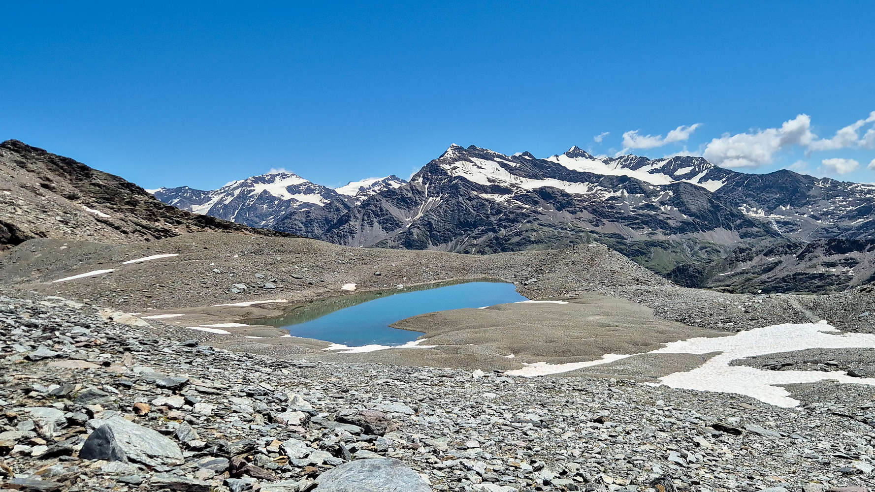 Our 10 minute scheduled break went by quick after some water, sunscreen, and map-checks, so we were soon back on our way. This time we exited the ski-road right across the lift-cabin through some obvious markings to the left (W). We went towards, and then under, the Val dell’ Alpe chair lift with the goal of not dropping elevation - as would be the case if the road is used. Here the terrain turns a bit more mountainous, with the slopes littered with boulders and the trail hidden at times. After 20 or so minutes of ascent we broke at the Col. at around 2,720m and headed directly N towards Laghetto di Alpe (2,740m), at which point we were finally rewarded with good views of the rest of the route. Having overcome this first low-low moraine just past Refugio Sunny Valley we were now on a long traverse of the slopes of the NE ridge heading towards the middle of the SE Face. We reached Laghetto di Alpe (2,740m) in good spirits, seeing the first of the printed route-cards on the sign-posts (!).