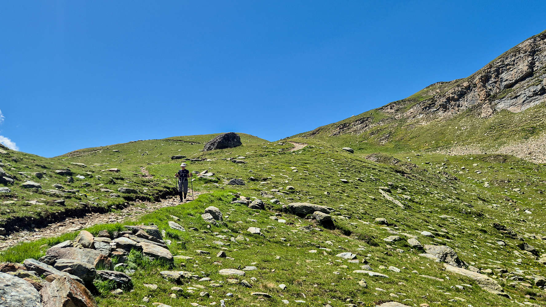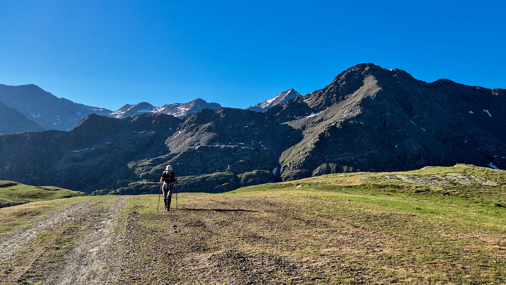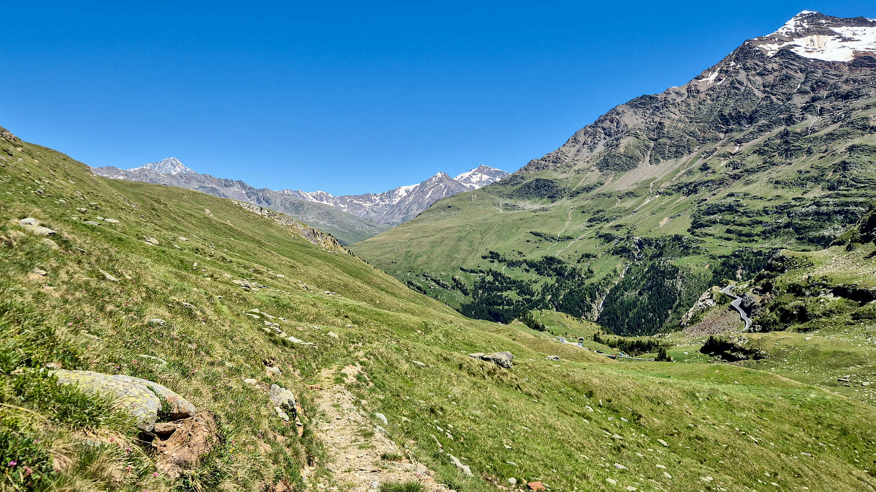 We continued on the traverse of the S aspect, passing by the seasonal lake above Laghetto dell’Alpe, seeing a few sights of “civilization” again, as a party of 3 enjoyed their lunch above the lake. We then passed by Laghetto dell’Alpe (2,740m) continuing our descent towards Refugio Sunny Valley. Although the traverse offered little elevation loss, the scenery was exceptional, and our pace was fast, looking to leave the hot ‘pan’ of the upper mountain behind. We arrived near Refugio Sunny Valley after a fast 25 minutes to see a few more people enjoying the sun around the lake. Descending via the road towards intersection 536/01 we ran into another party of 4, ascending perhaps to relax somewhere around Sunny Valley. We reached the descent trail of Ponte dell’Alpe after 30 minutes from the lower moraine only to see signage suggesting 45 more minutes to Ponte dell’Alpe. As such we picked up the pace descending the sunny green switchbacks below Sunny Valley.