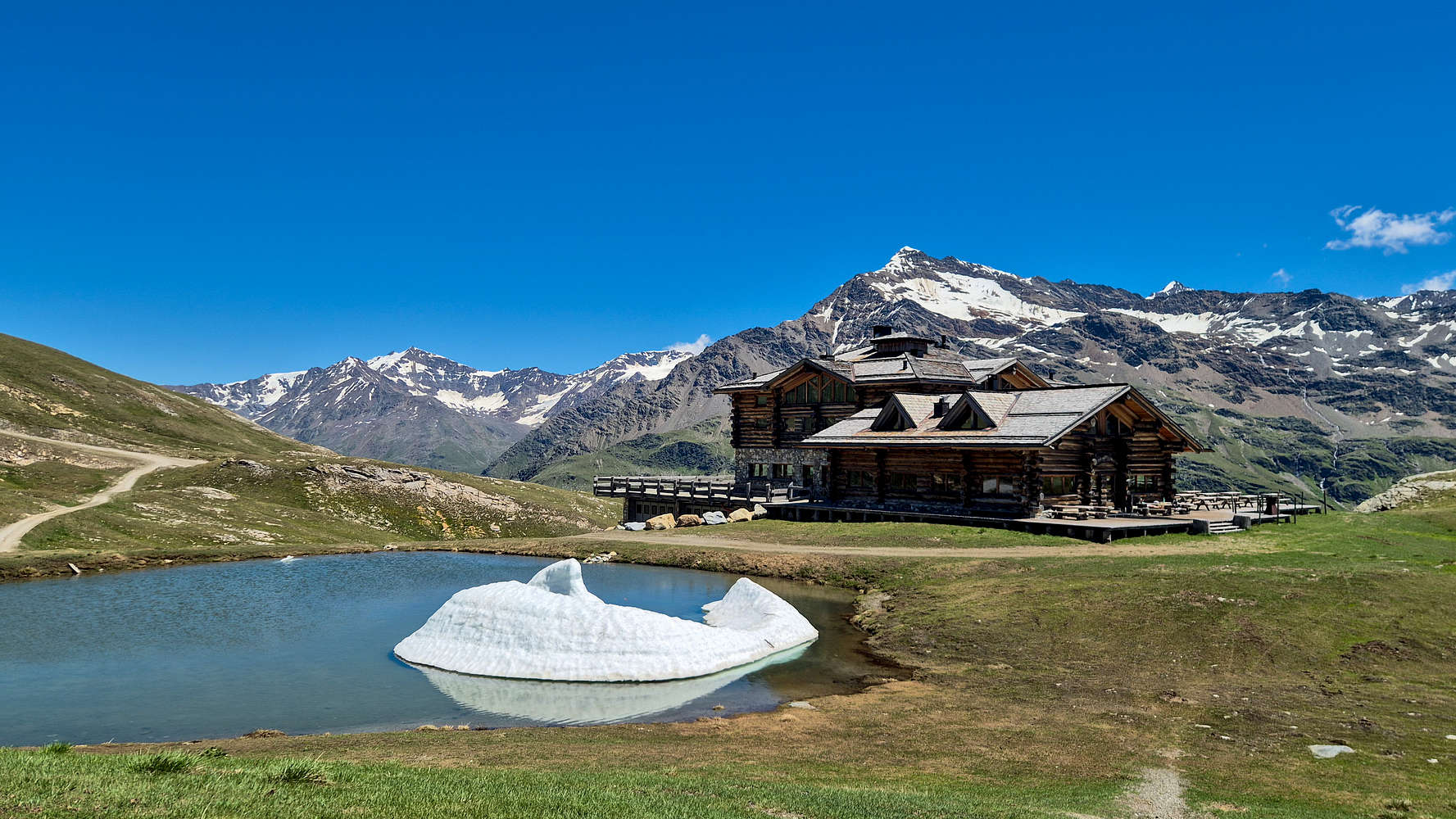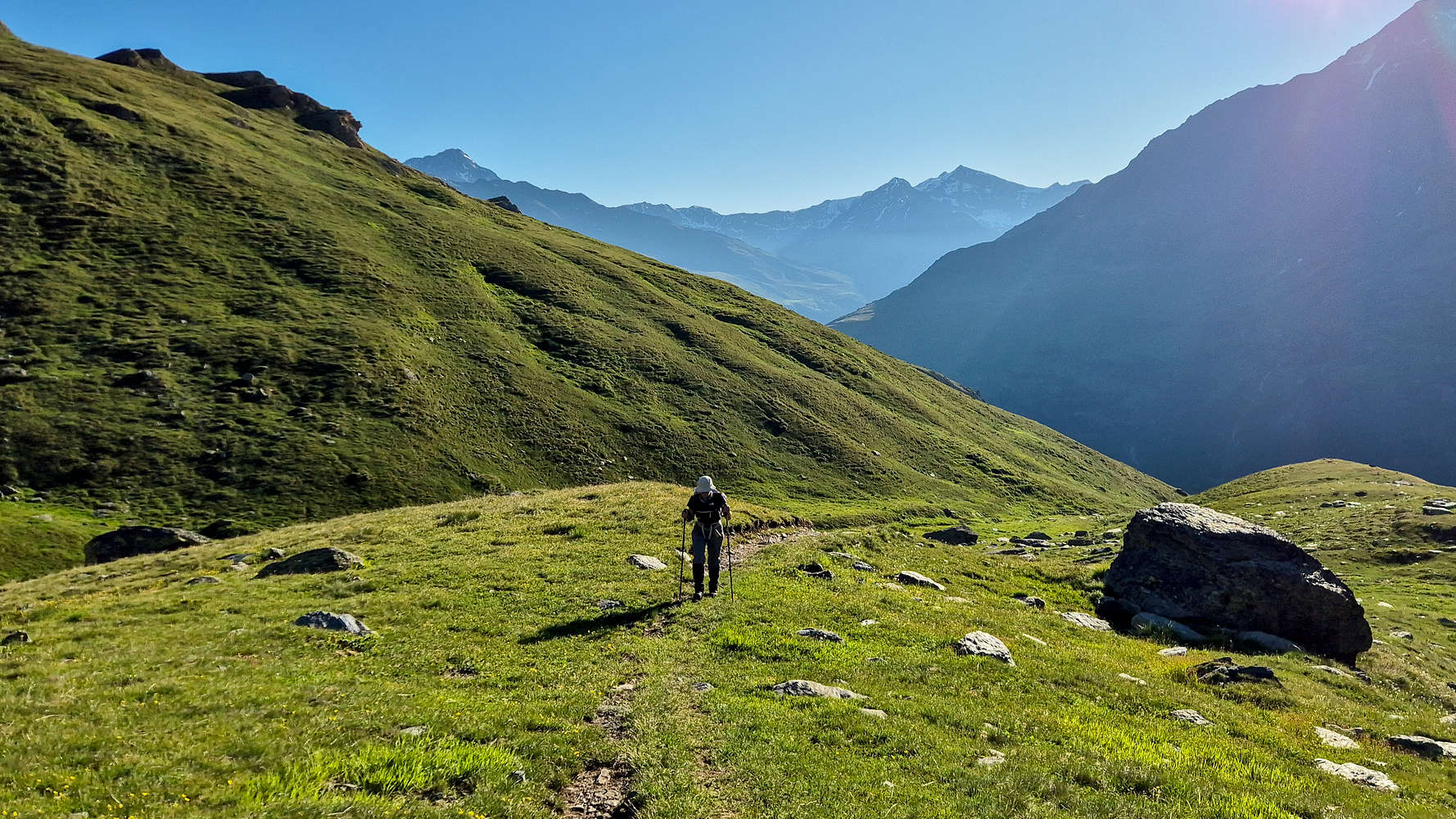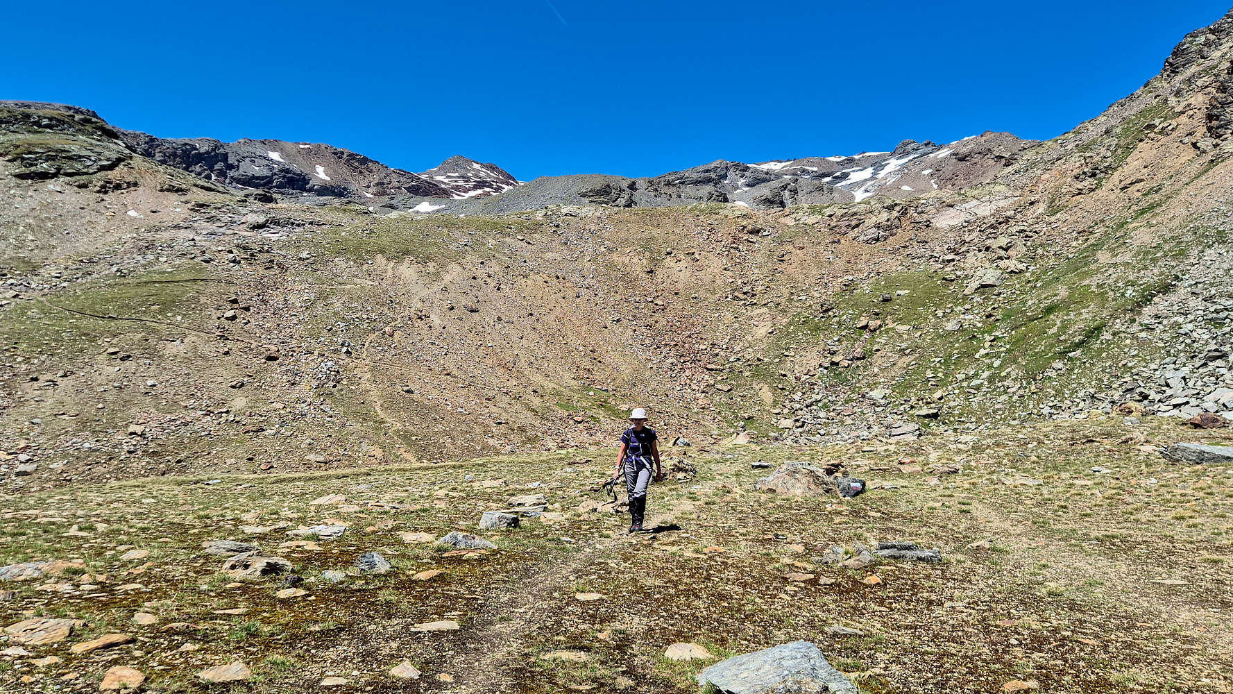 We continued on the traverse of the S aspect, passing by the seasonal lake above Laghetto dell’Alpe, seeing a few sights of “civilization” again, as a party of 3 enjoyed their lunch above the lake. We then passed by Laghetto dell’Alpe (2,740m) continuing our descent towards Refugio Sunny Valley. Although the traverse offered little elevation loss, the scenery was exceptional, and our pace was fast, looking to leave the hot ‘pan’ of the upper mountain behind. We arrived near Refugio Sunny Valley after a fast 25 minutes to see a few more people enjoying the sun around the lake. Descending via the road towards intersection 536/01 we ran into another party of 4, ascending perhaps to relax somewhere around Sunny Valley. We reached the descent trail of Ponte dell’Alpe after 30 minutes from the lower moraine only to see signage suggesting 45 more minutes to Ponte dell’Alpe. As such we picked up the pace descending the sunny green switchbacks below Sunny Valley.
