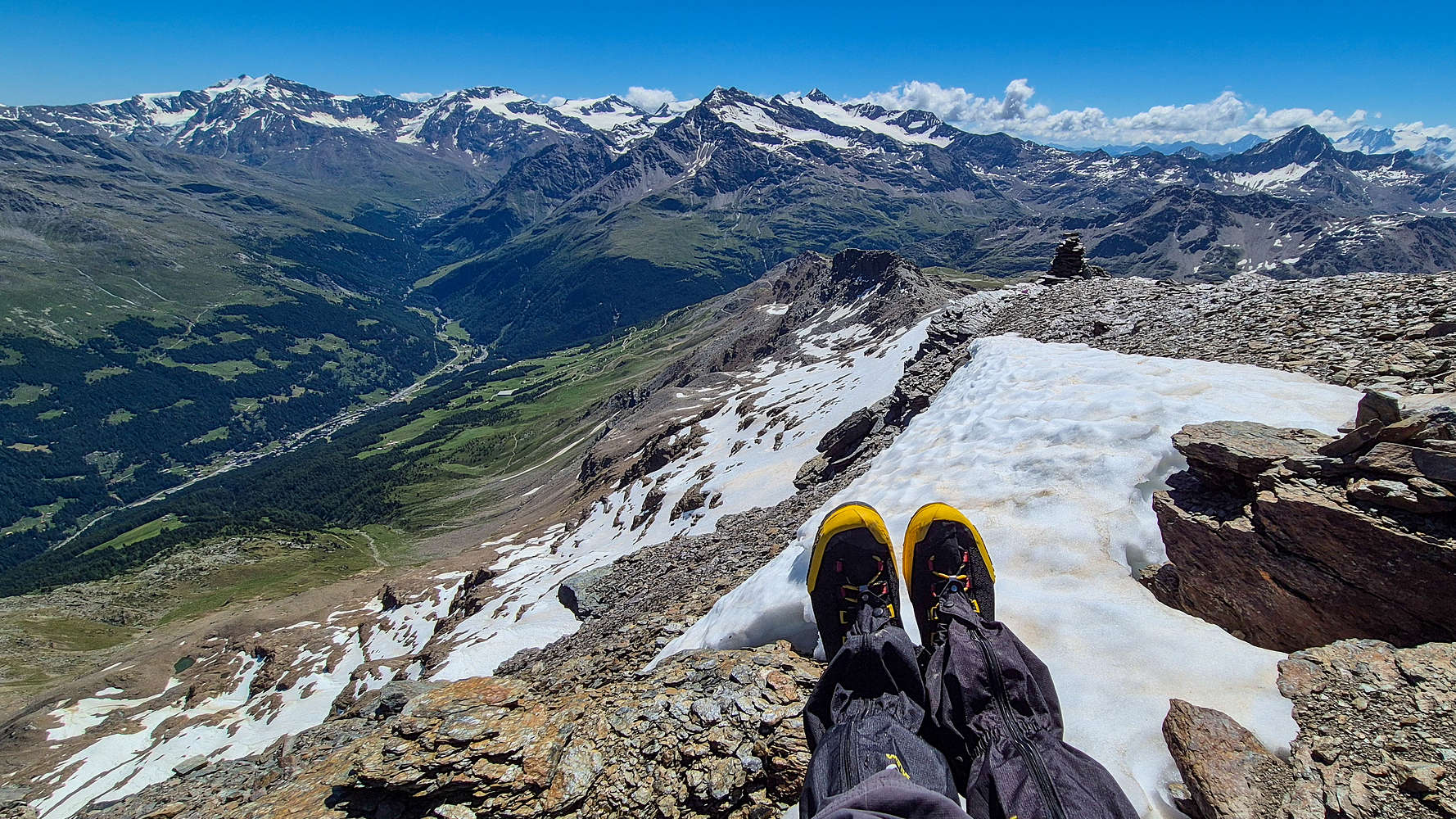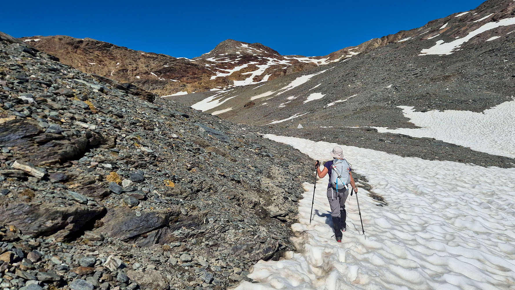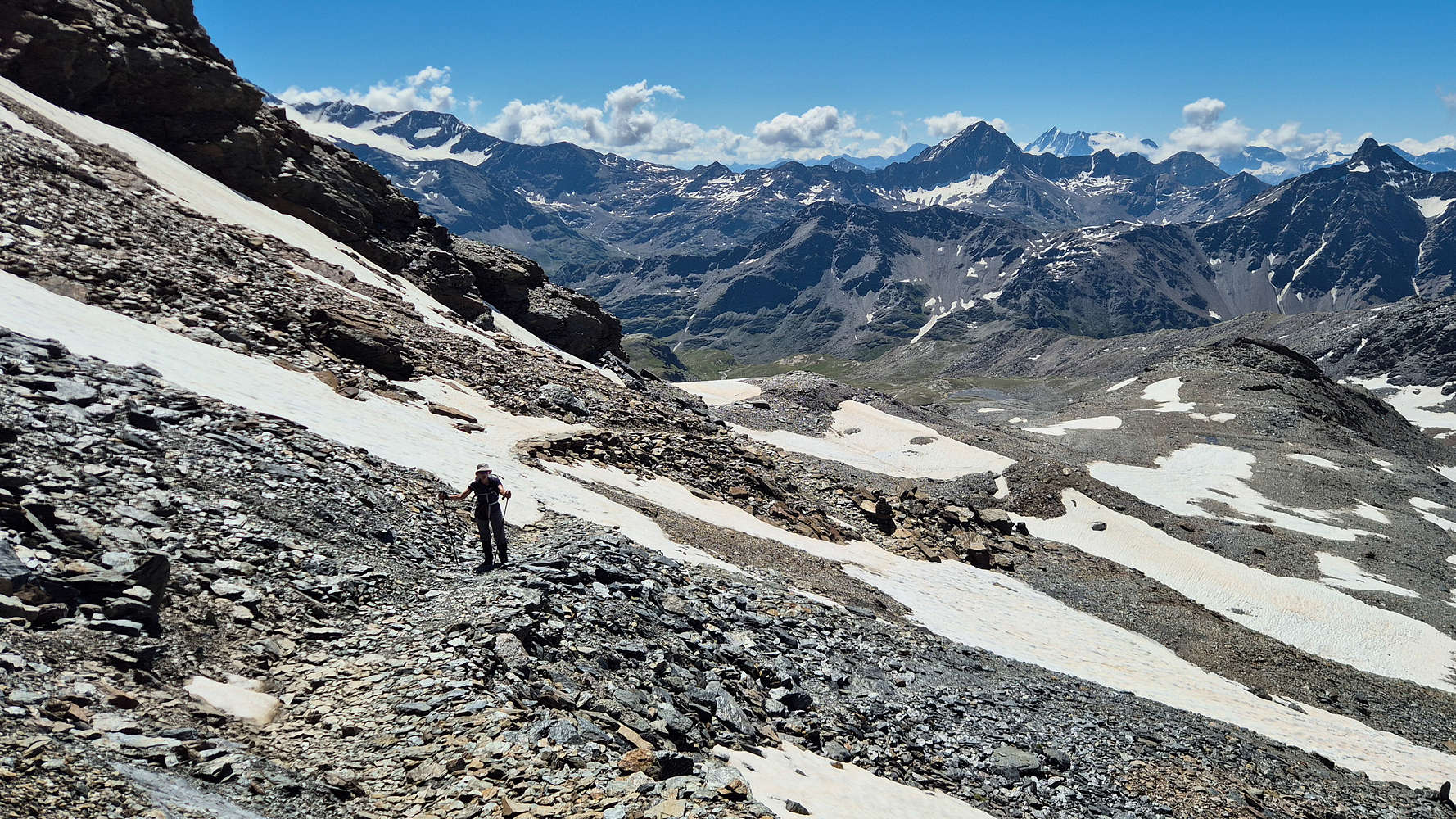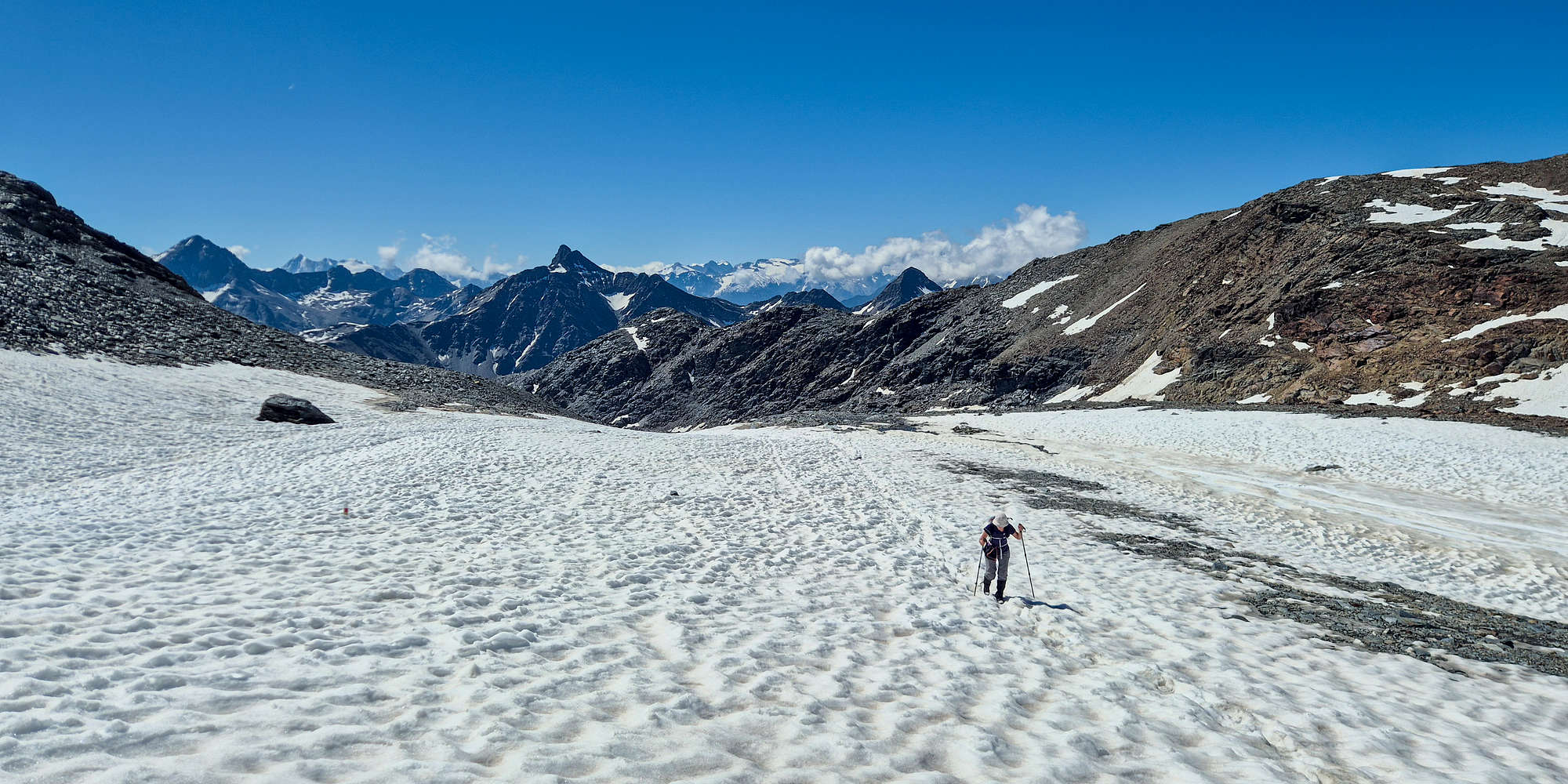 Most probably greatly affected now by the high temperatures and beating sun we took some time to rest before making the final push. Here, at the edge of the large snow field ample water ran down towards the moraine and we enjoyed endless views of the Alps to the S. Due to the fatigue we took some time to get going, but we were thrilled to be in the alpine zone of our 3,000m objective, with the snows still holding-on strong on the upper slopes. Our spirits were buoyed by the faint sight of the summit cross, finally! We followed the obvious track heading through the snow but found the going extremely tough due to the heat. The snow was already melting quickly and its sugary nature was setting us down all the way to the knees on every other step. Nearing the now the separating moraine of the snowfield just below the summit, and ready to tackle the switchbacks after 20 minutes on snow, we turned around to spy another party of 2, the only one we had seen all day. At this point we had just broken above the mini-moraine separating the field into two.