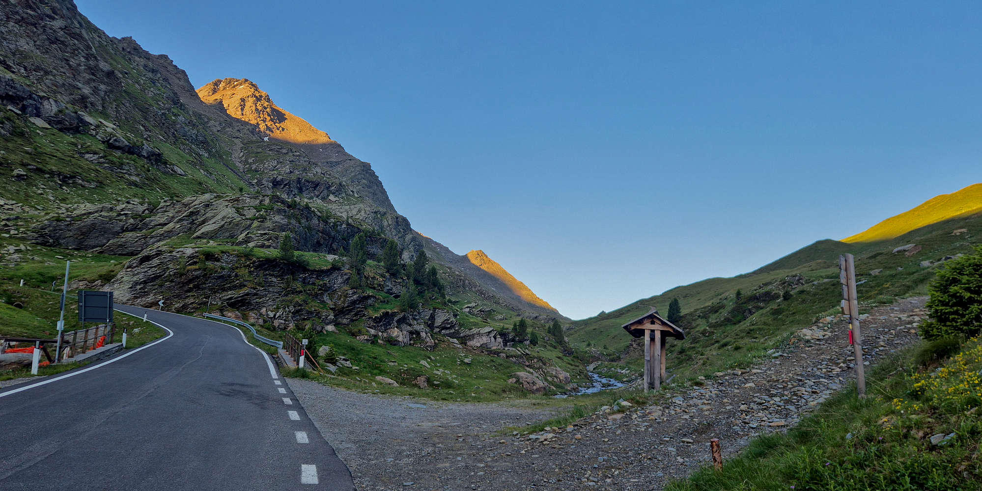 Ponte dell’Alpe looking W between Gavia to the left and Sobretta to the right, at dawn.