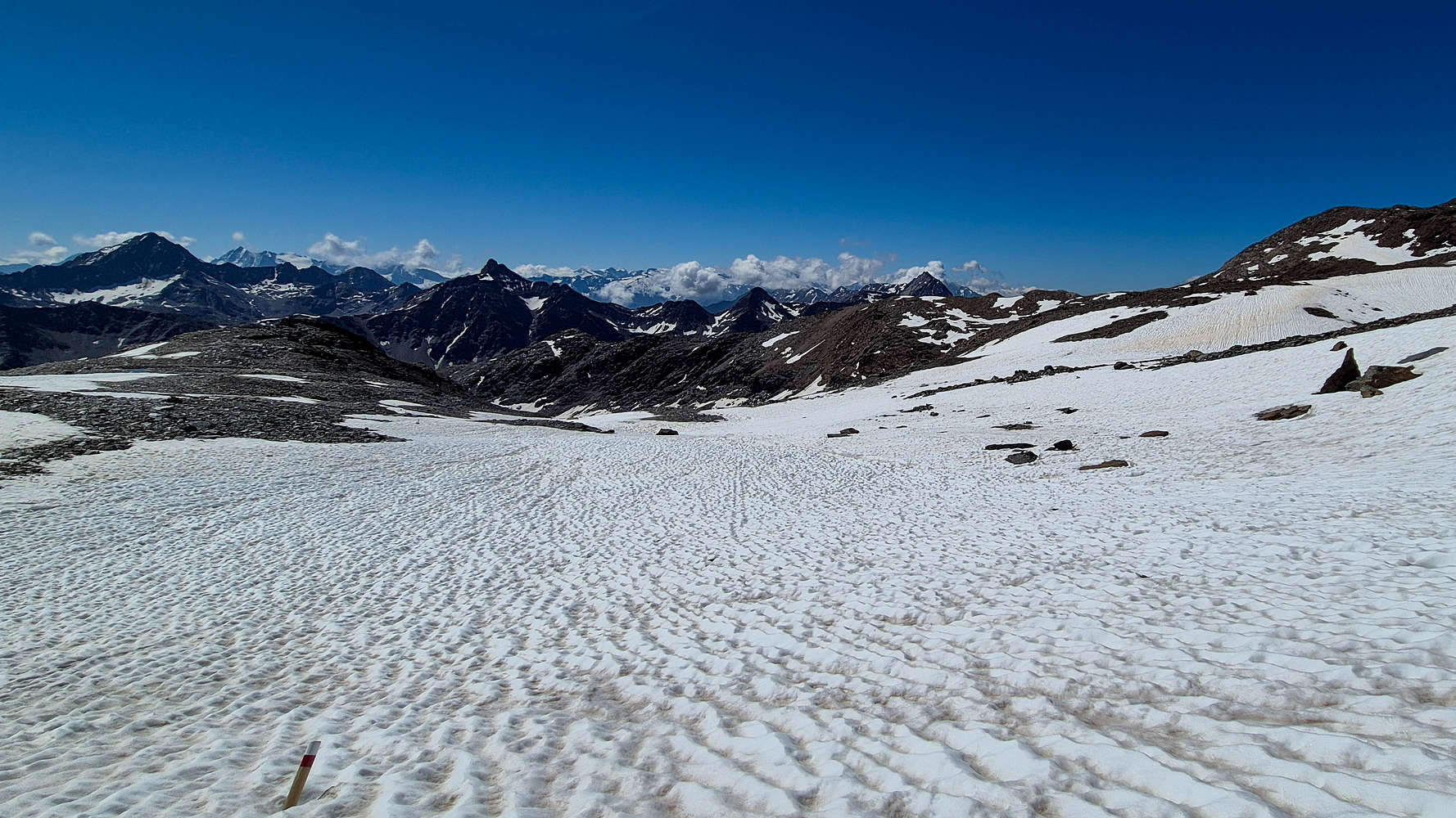 The snow field on Sobretta, a trail marker visible at images lower left.