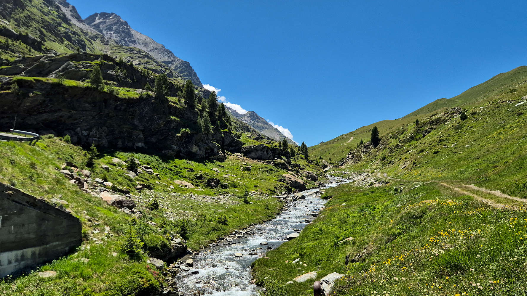The Marmots were now well asleep with the noon sun beating down, while far above us within the Forni Group, especially on Pizzo Tresero (2,594m), sluff avalanches and rock-slides darkened the steep slopes of snow. It was easily around 25C under the sun even up here at 2,500m, unbeknownst to us the second hottest day in the 21st Century for the Alps (after 2003). We retraced our steps and meaning to turns left farther up the slope, in a bid to lose elevation faster, we took a false intersection. Luckily the slopes were easy and we quickly connected with the trail below. Taking the 563 bike route, a few rungs above the dirt road, we managed the traverse of the lower Val dell’ Alpe slopes easily, although the trail was rather narrow. Soon we reached the pastures above Ponte dell’ Alpe, catching a glimpse of the local cattle. With a terrible migraine I yelled back at Terry that I’d head down fast, and made my way next to the bridge in a bid to relax before leaving. I completed the hike in just over 7 hours, but my migraine had much more to give, especially since the exhausts of bikes driving up and down SS300 “Gavia Pass” echoed next to me.