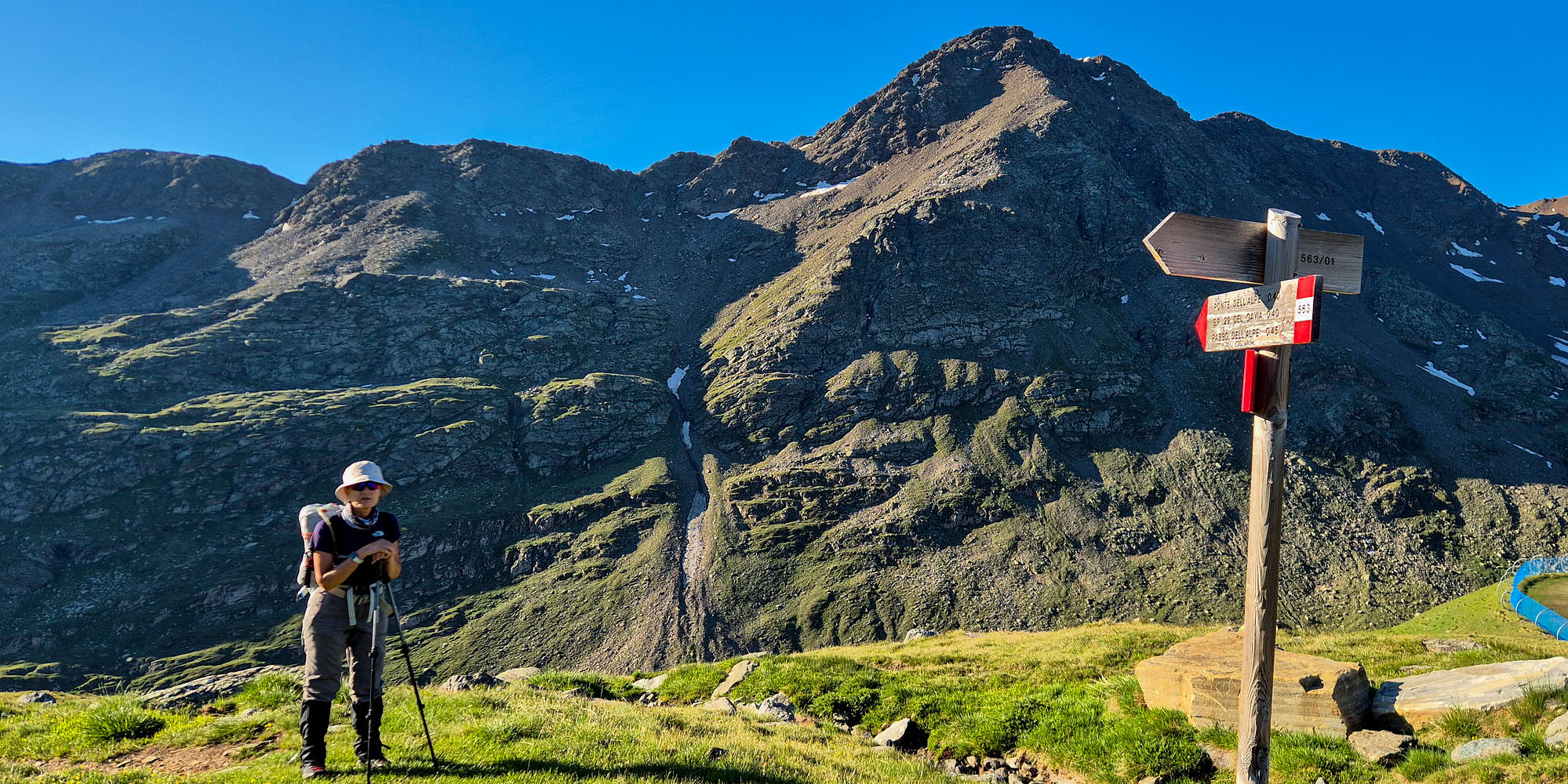 The cool morning air persisted under the first light, and with our first views of running water Terry burst into song; some tune from the Sound of Music — a Nieve favourite. I took little time to ruin the mood by reminding of the toils we were yet to face, but maybe I felt like the Marmots; someone was ruining my morning peace and quiet. We ascended under the mornings sun the section towards the Sunny Valley Intersection (563/01); only right before the top did it get steeper, although not challenging in any way. This top-out almost marked the 1 hour point from the start of our hike. Throughout we were treated to lovely views of the green slopes & Cima di Gavia (2,987m) across Torrente dell’Alpe off our backs. Here we met with the ski slopes/dirt roads heading towards Refugio Sunny Valley. After another few minutes heading up the slopes we reached the vista of Refugio Sunny Valley, and sat down to rest by the cabin-lift top-station. It had taken us about 1:15 hours and we settled for a timed 10 minute break.