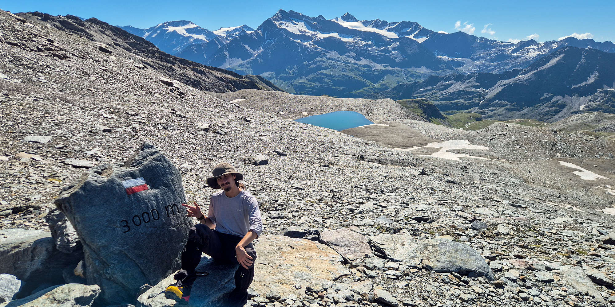 Yours truly chilling at 3,000m. The Laghetto and Forni group in the background.