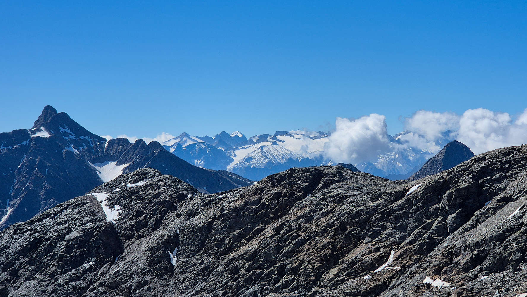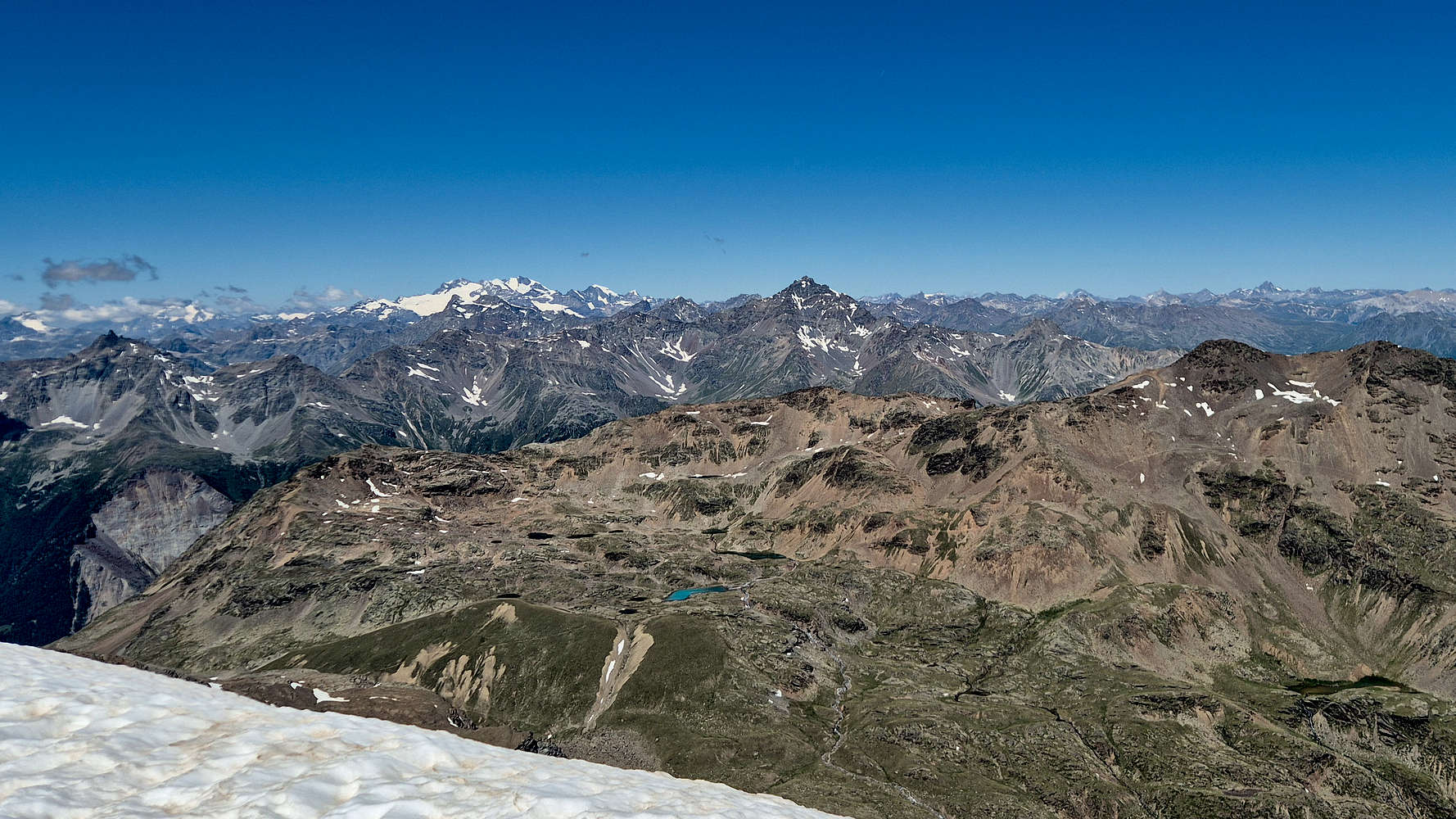 View to the N from Sobretta, Cima Piazzi & Bernina visible.