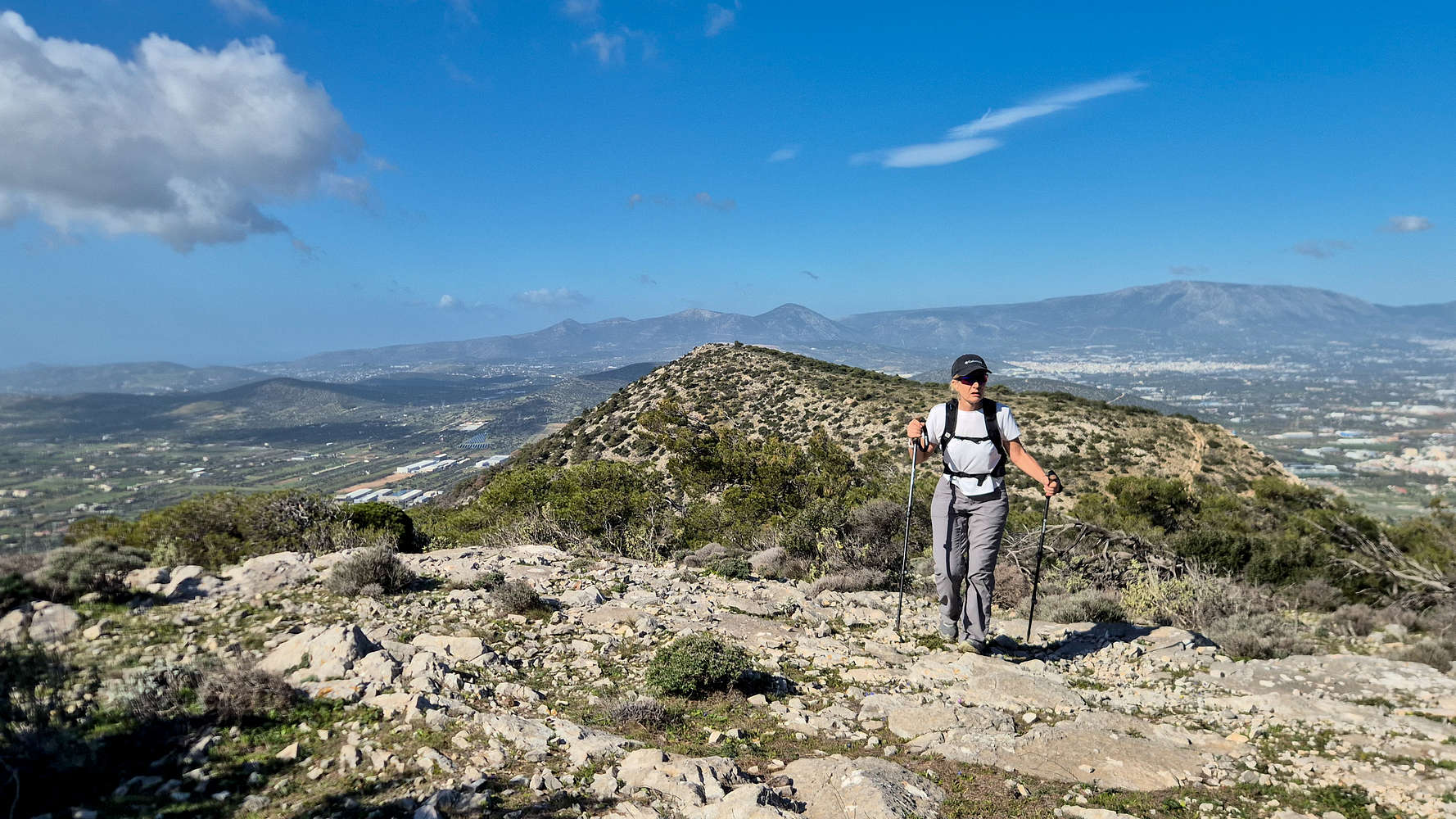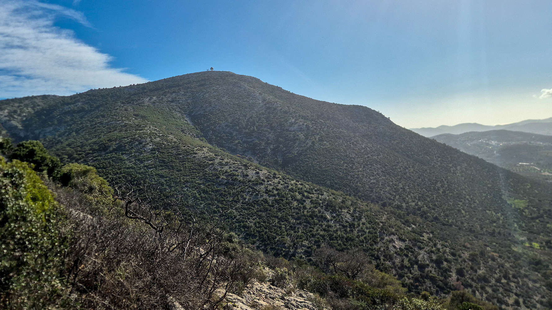 Although a faint track could be made out, the lack of markings and frequent bands of vegetation meant that route finding was again a not-so-simple affair (T2). Gaining the crest of the ridge, navigation was simplified and we made quick progress in approaching Kastro (429m). Once at the base of its steep summit cone we opted for a direct line on the steep and rocky slope of the West aspect. Ignoring the lack of a track, the views, terrain, and limited exposure offered a pleasant combination on this section. That being said, the day’s high temperature found me dripping with sweat as we continued uphill.