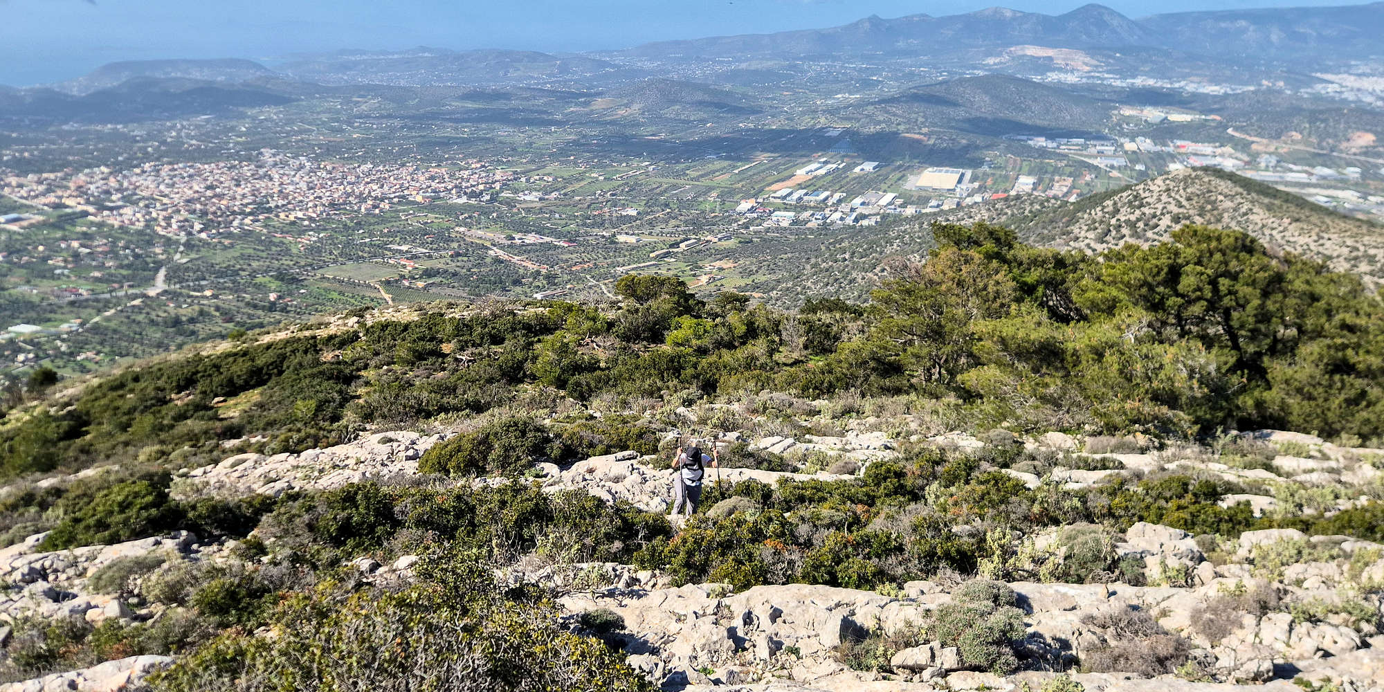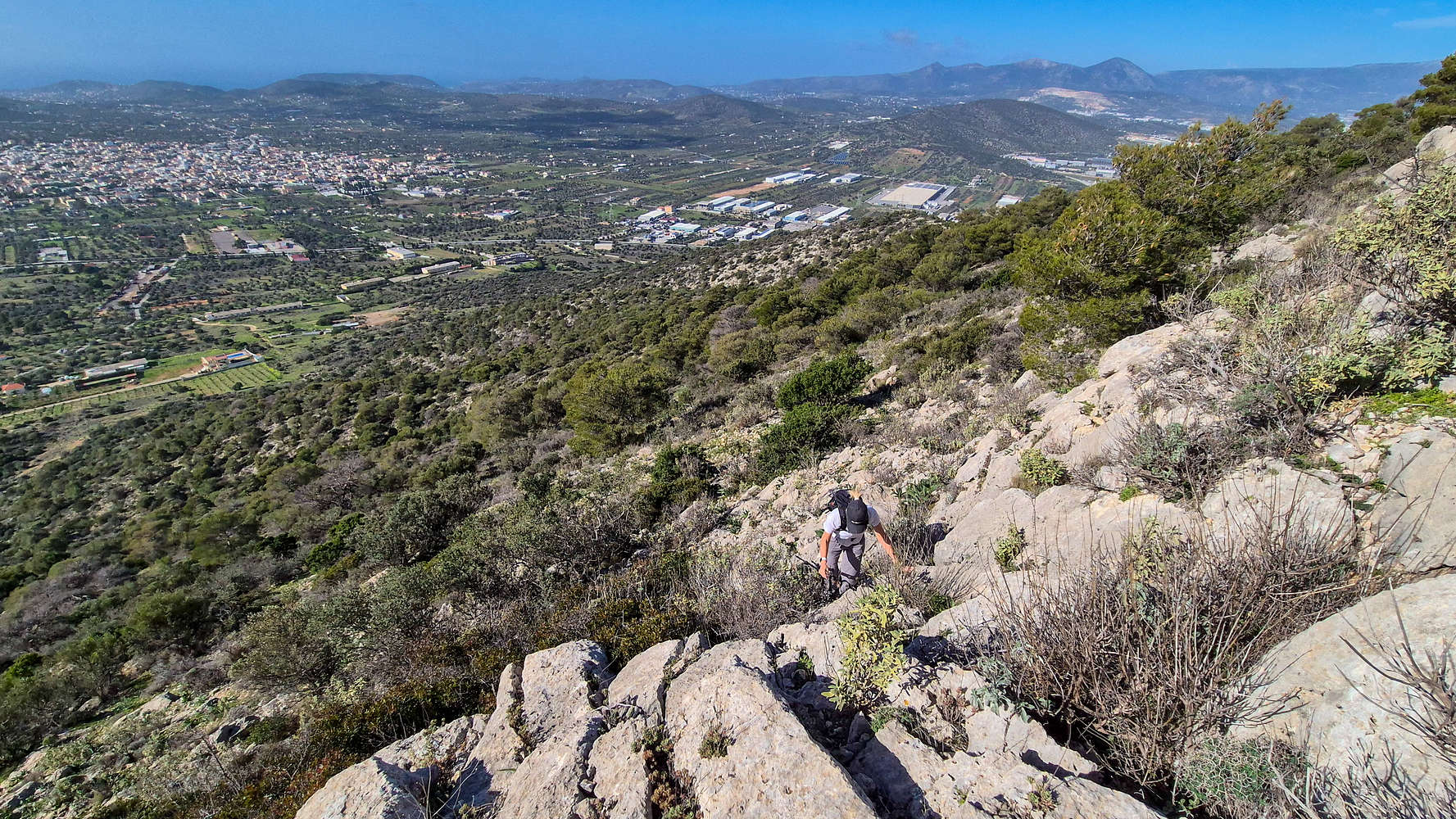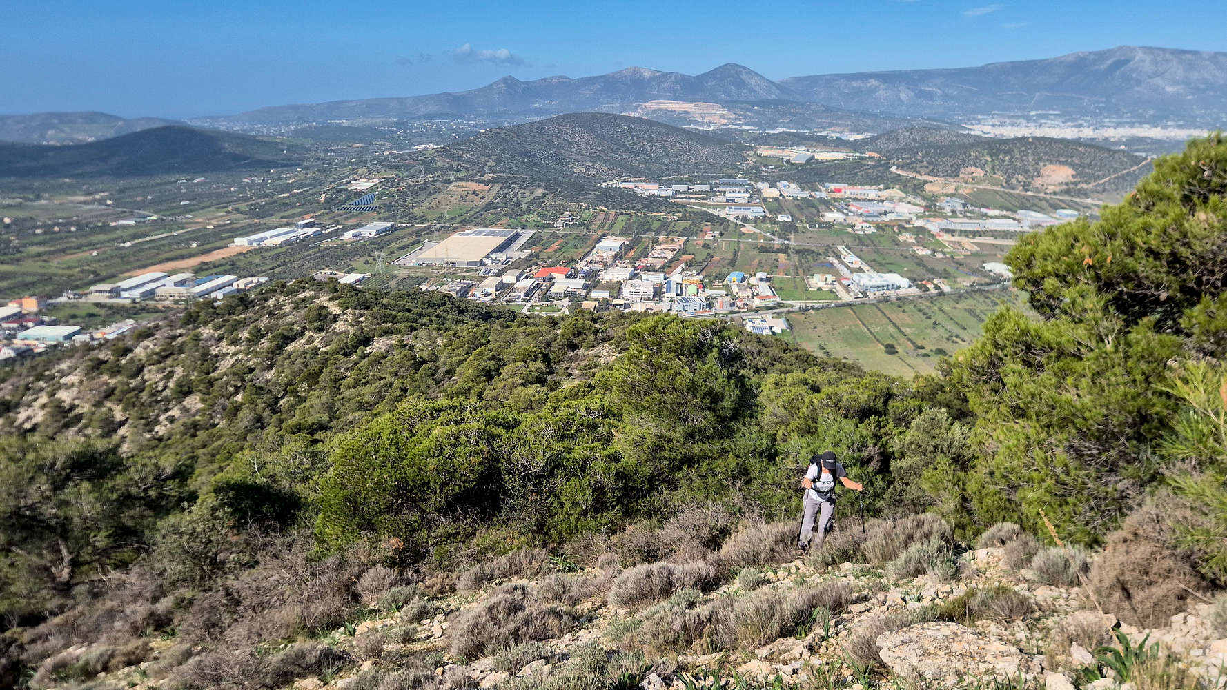 For its small stature, the mountain proved a hand-full so far after nearly 2 hours for the 3.8km and 513m of vertical gain, and it was certainly not done yet. The flat summit which houses the radar for the Athens International Airport was quickly overwhelmed by the mid-day winds, and being unable to find sufficient shelter, we briefly sat behind some brush and rocks, which provided protection to have a snack. We spent no more than 3-4 minutes below the summit before setting off back down, anxious to face a complex return.