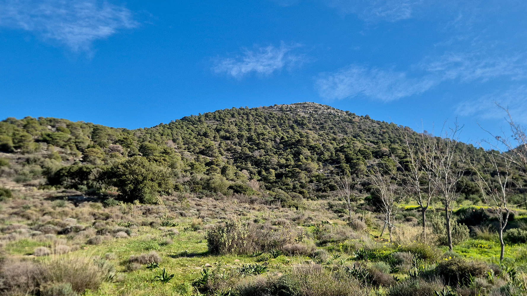 Oros Merenda (614m) [P-414] [”Όρος Μερέντα”] is a relatively unknown mountain of Eastern Attica, separating the settlements of Markopoulo and Keratea near the Athens International Airport. Although the second highest peak of the area, its inland position and contained mass lead to it being overlooked compared to its neighbor Paneio (648m). Sport climbing and biking on its lower reaches is popular while hiking routes are near forgotten. This is for good reason, as for most of the year, the Karstic terrain turns into an arid wasteland. But for a few weeks a year, the area is approachable, and even pleasant. Its small size also hides deep historical ties with local human activity and legend.