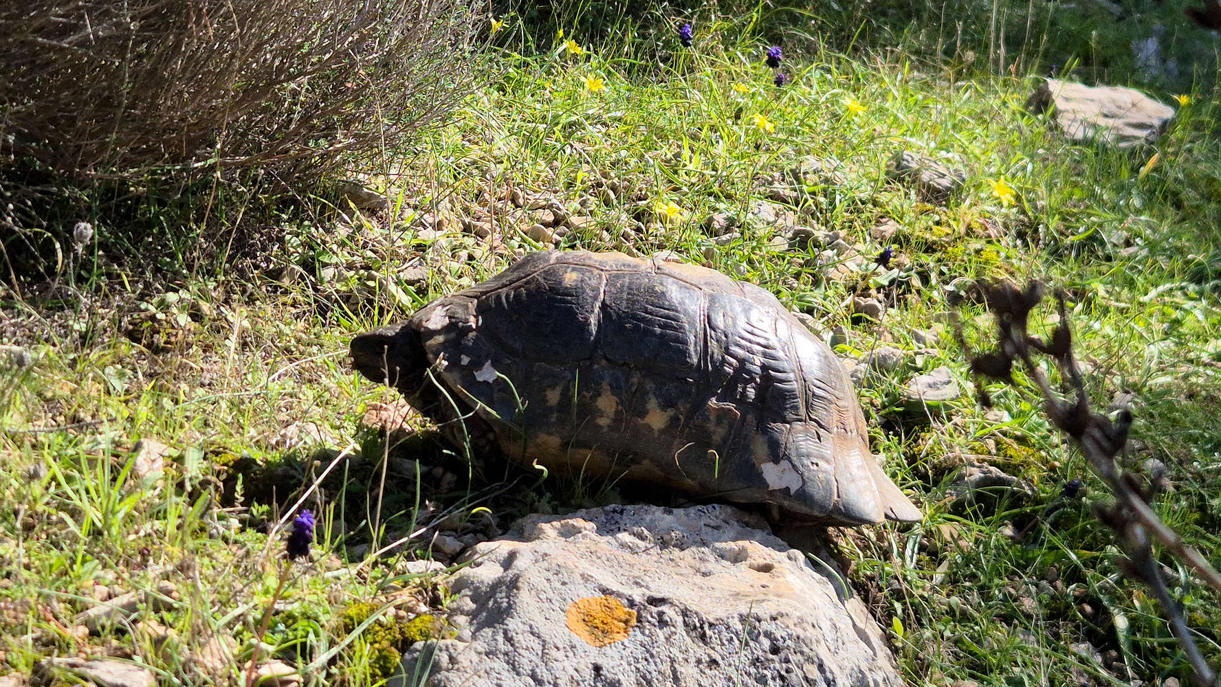 We passed the supposed ‘trail’ indicated on OSM, and continued on our natural line, and at 270m reached the river-bed for the first time. We followed the ravine for a bit before once again traversing in the slope of Kastro (429m), to avoid the densely vegetated ravine (BW2+). In our descent we also ran into one of the residents, an unbothered Marginated Tortoise. Finally, we were able to traverse the ravine one last time (T2, BW1+), and reach the dirt road leading to the lonely house which was our exit marker. We exited the majority of the difficulties after 1 hour from the summit.