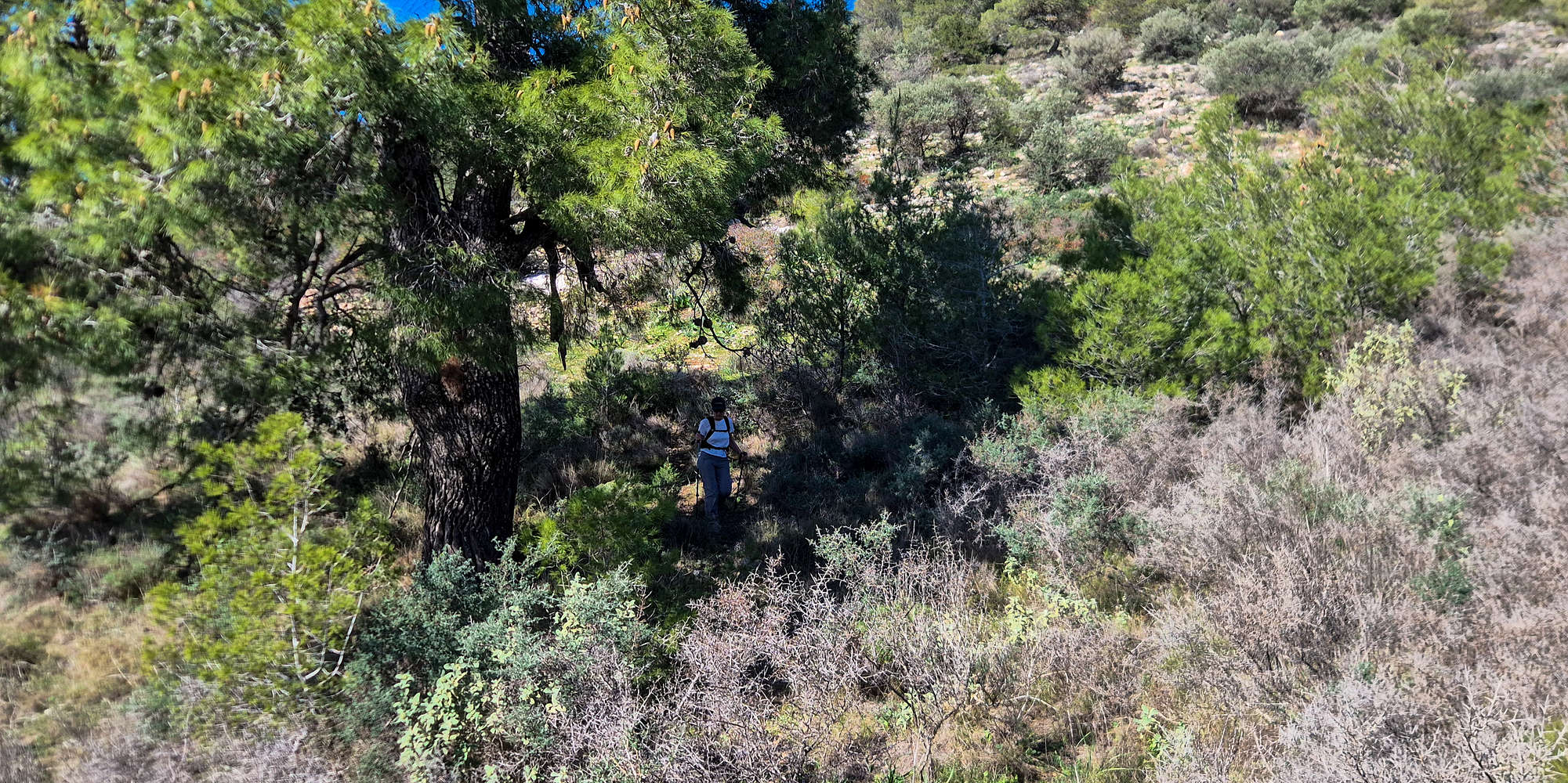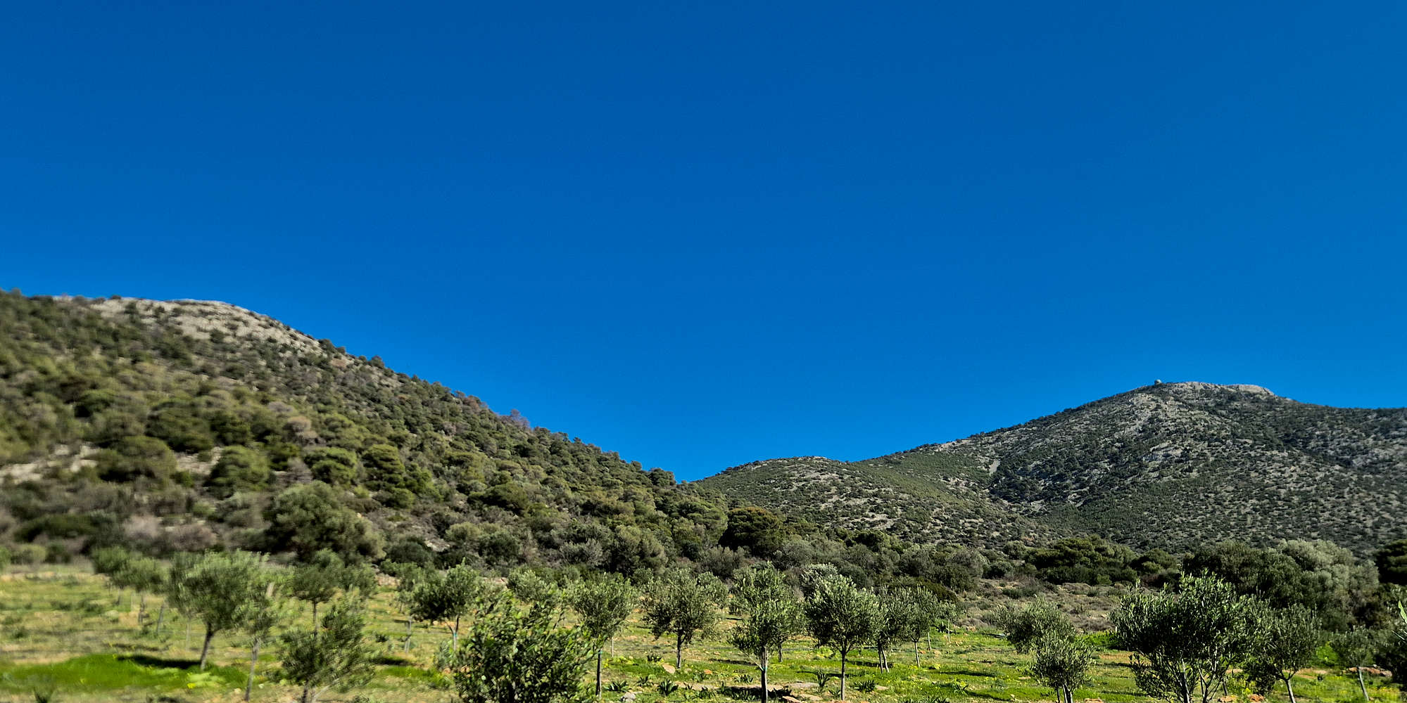 From here, we continued for a few meters on the dirt road, before cutting through a series of very vague tracks (T2, BW1) to the right, in order to reach the next road over. The gully had brought us too far East and now we had to pay with some more easy traversing. At last, we reached the asphalt which we followed further down, reaching a large property across which we had parked. To avoid a long circuitous route, we opted to instead walk through their Olive grove, waving good morning to one of the workers as we did, and in full view of both Kastro (429m) and Merenda (614m). A fitting end to 3 hours of ‘easy’ bushwhacking on one of Attica’s most unknown massifs, but I am most certain that we didn’t really help Terry’s knee problem. There is always next time.