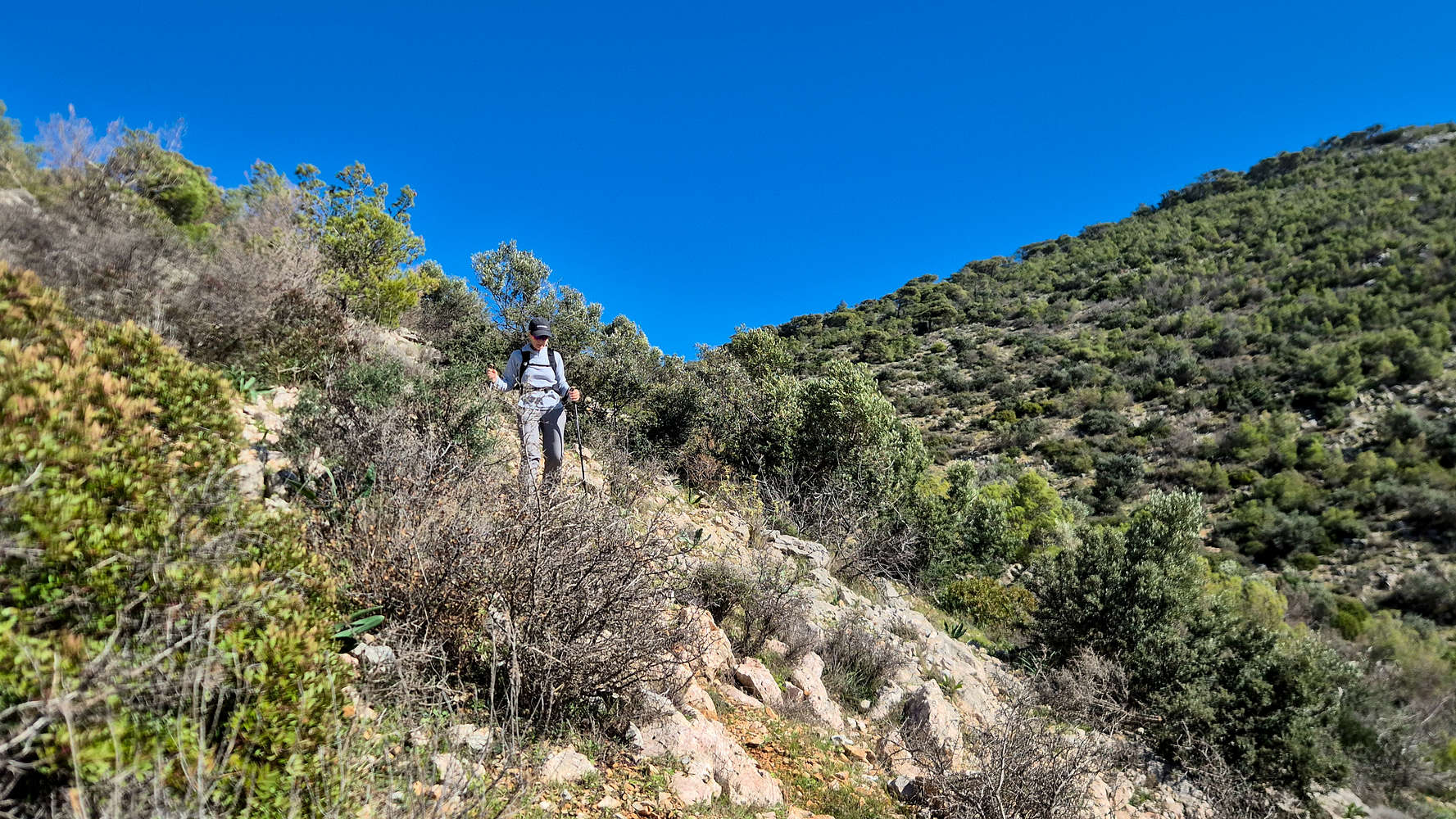 We arrived at the obscure dirt road that marked our trailhead just after 09:45, and managed to set off before 10:00, and followed the openings among the vegetation heading up and to the left towards Kastro (429m). We mistakenly ascended a couple of stone terraces above our goal, and after some re-routing we continued in a W direction along the foot, before turning right and uphill. Without having reached the ridge proper yet, but continuing to find a navigable slope, we made swift progress. The terrain however, quickly made its unrelenting nature known as we navigated the rocky slope which was steep but mostly secure (T2+, BW1-). It took us roughly 25 minutes and 120m of elevation over 1km to join the indicated track at the ridge.