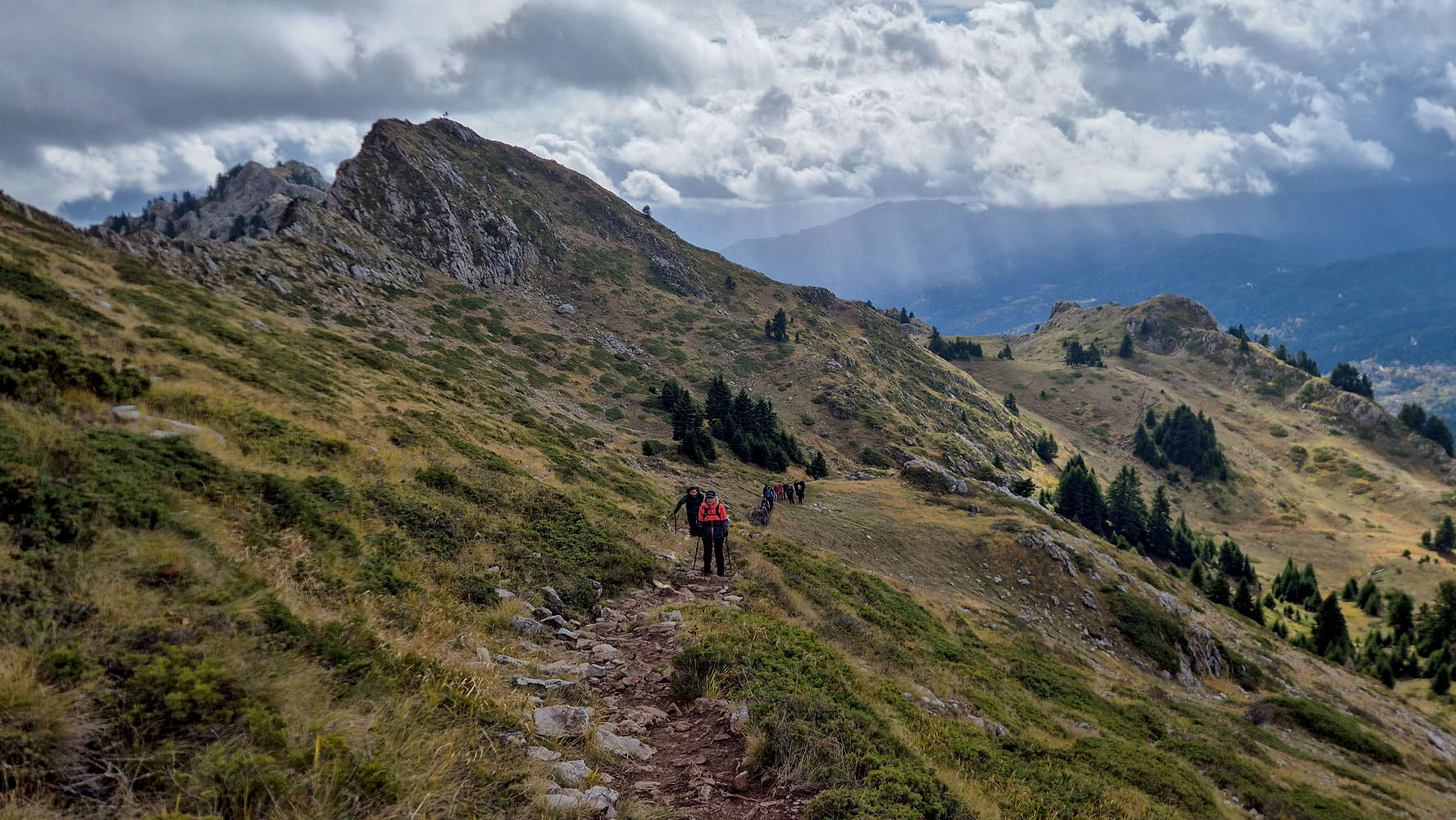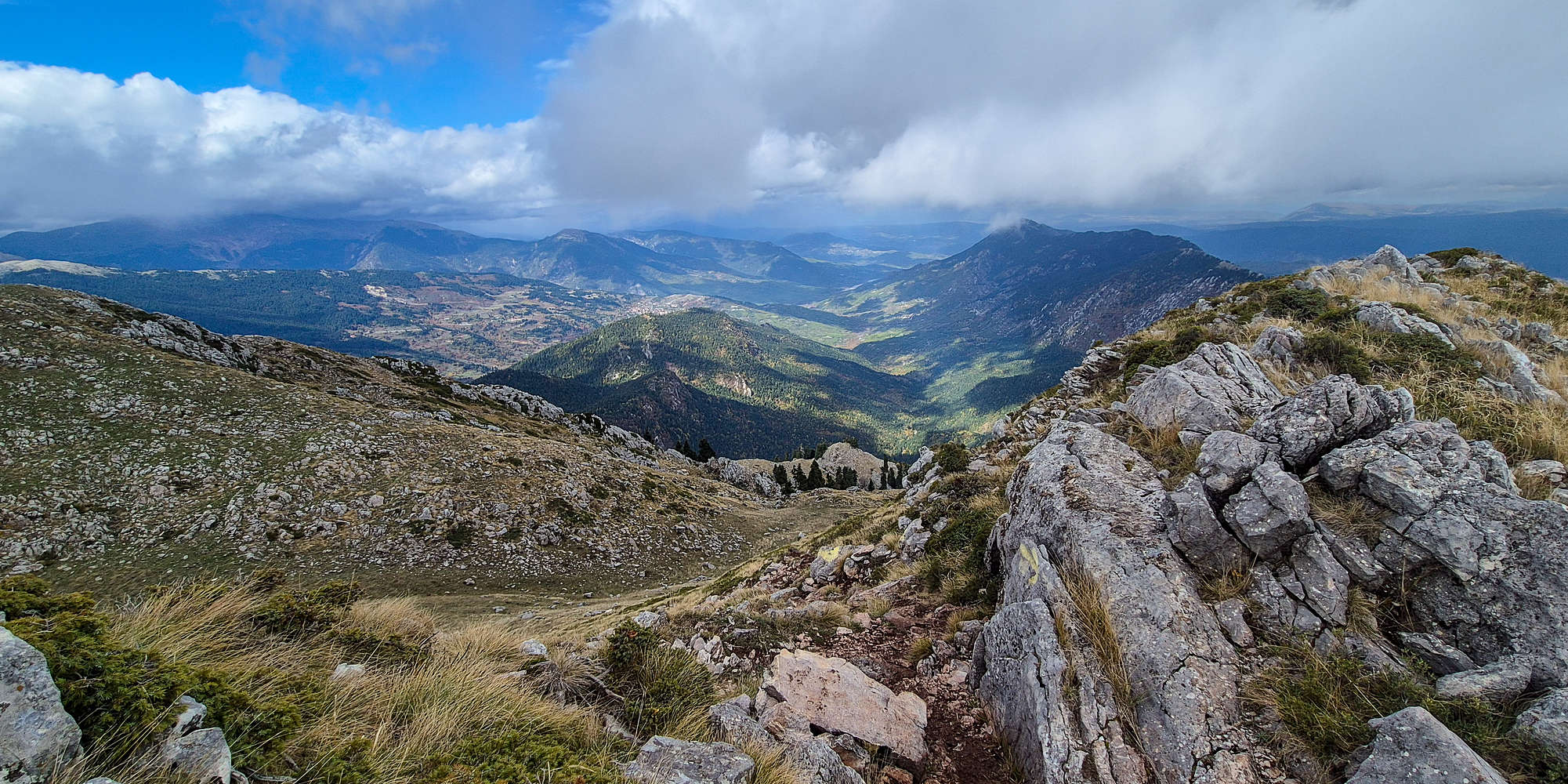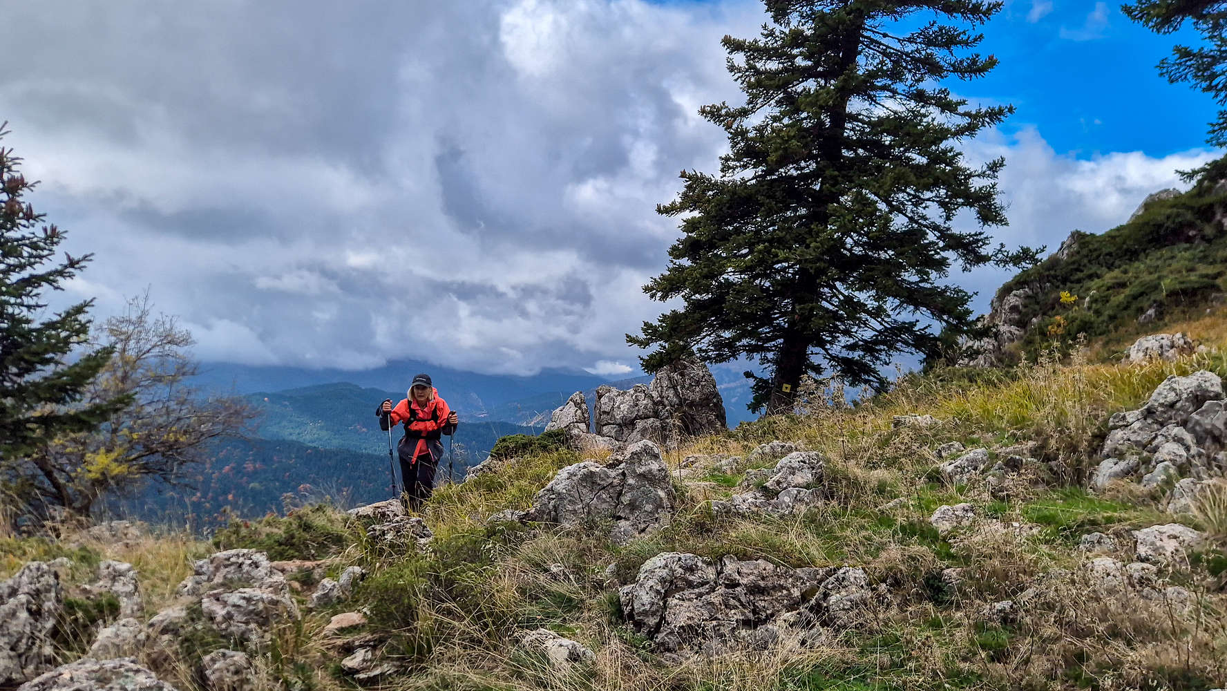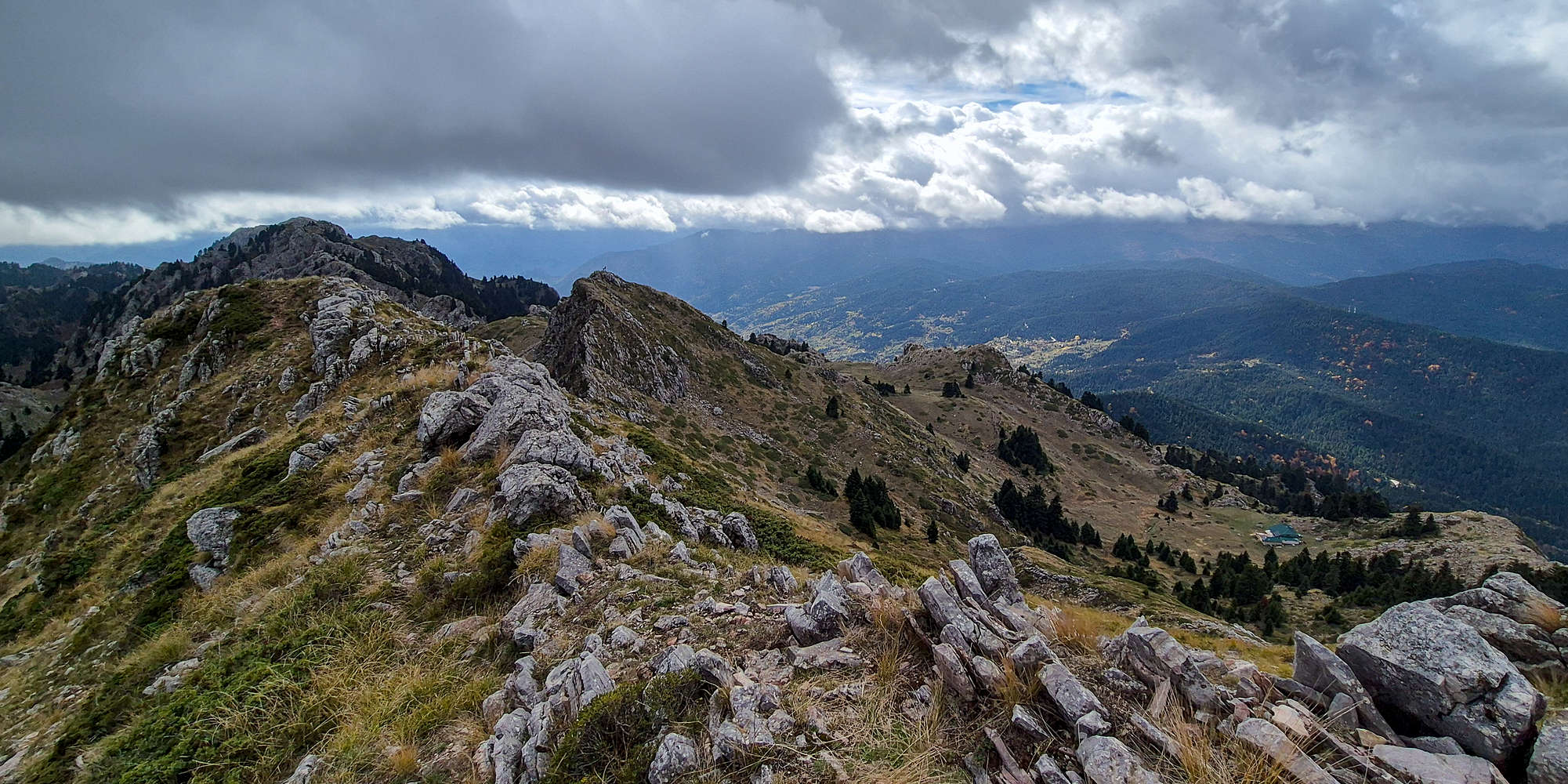 The final ascent follows a steep shoulder (T2) with a prominent boulder painted in red. From there, grand views opened over the northern valley of Koziakas (1,901m), then the path turned right for the short link to the main top.