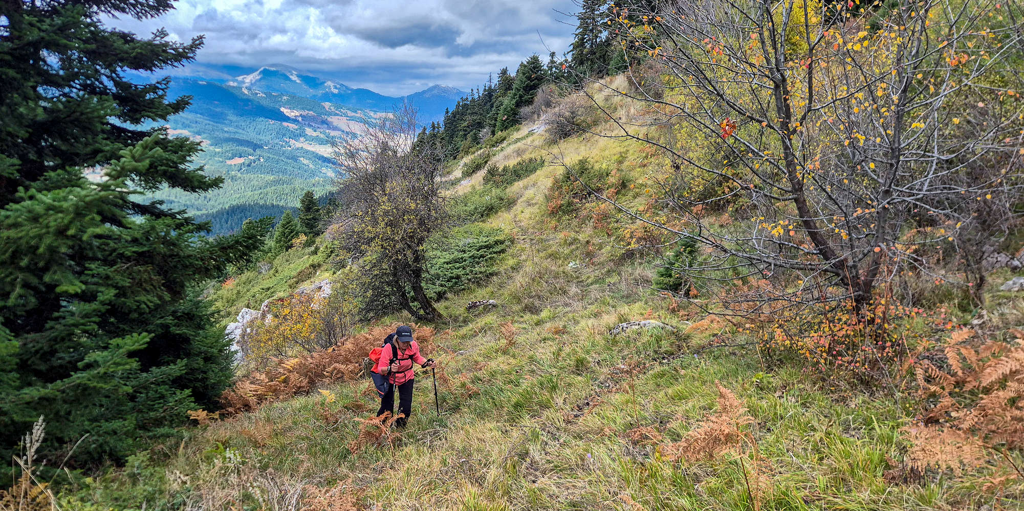 The official E4 meanders endlessly, often forcing hikers onto forest roads. The “yellow” route, while also circuitous, offers a better line and more mountain feel. It climbs a dense slope (T2, BW1) toward the forest’s upper edge before turning sharply left into a traverse—narrow in places but scenic, with fine views into Pindos (T2+). The warm autumn hues proved a pleasant accompaniment to the climb.