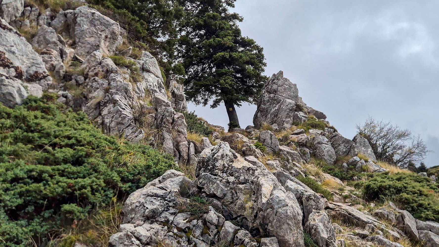 Traversing south across the western slopes of Koziakas (1,901m), we gained height gradually. Despite the E4’s popularity, the late hour meant we hadn’t yet seen another soul. Faint yellow markings branched left at one point, and after a brief detour, we followed them—leaving the E4 for the so-called direttissima.