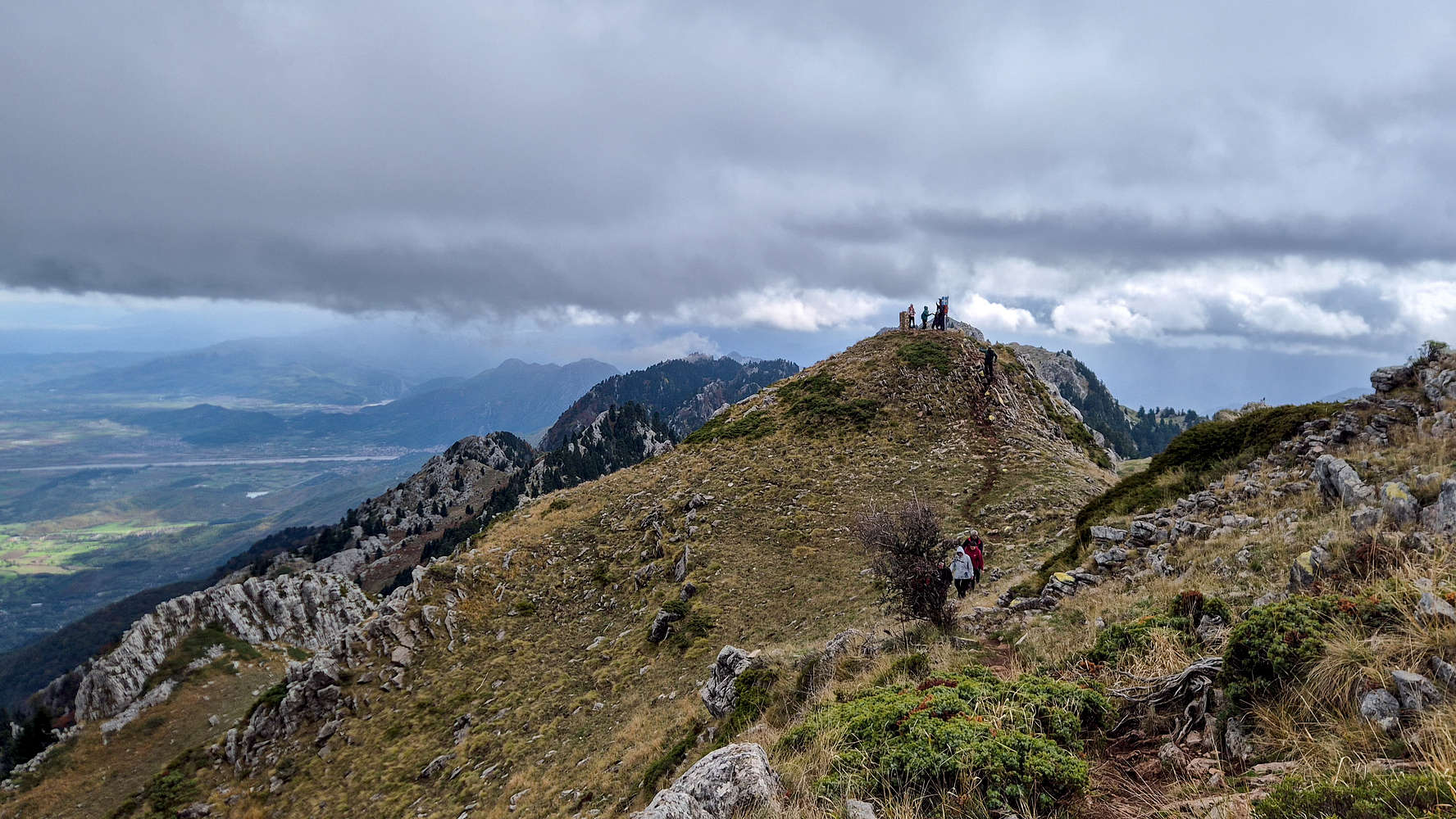 Even under heavy clouds, the summit panorama was excellent. The Plain of Thessaly spread far to the east, and the Gate of Pindos stretched across the northwest. To the south, the ridge of Koziakas (1,901m) rolled away magnificently, while Lake Plastiras, over 1,000m above sea level, seemed to hover beneath the clouds.