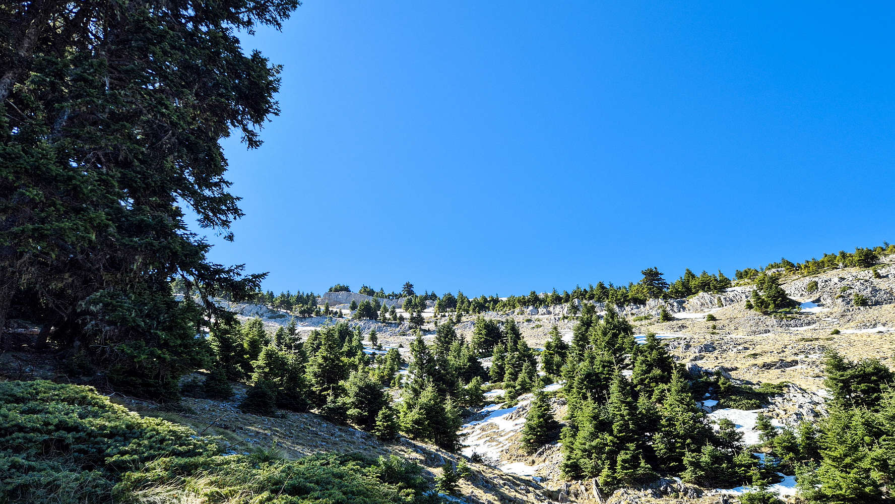 From here the trail follows a direct line on crude steep switchbacks along the couloir and up the North Face keeping on its left side. The continuing pine and fir forest is very welcome as it increases trail stability and reduces exposure. The trail feels secure and is well marked so we continue up, without concerns of exposure or the need for scrambling, so far. Throughout this section excellent views of the steep couloir, the North Face cirque above, and Chelmos (2,355m) S headwall behind, are offered. The trail continues with the forest almost until the couloir exit at 1,900m which we reached after 40 minutes — 1 hour total for 348m gain. Here a set of slabs offer a nice viewing position to look across the valley towards Chelmos (2,355m) and thus, was our break stop.