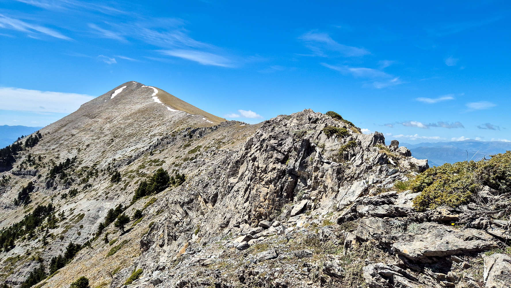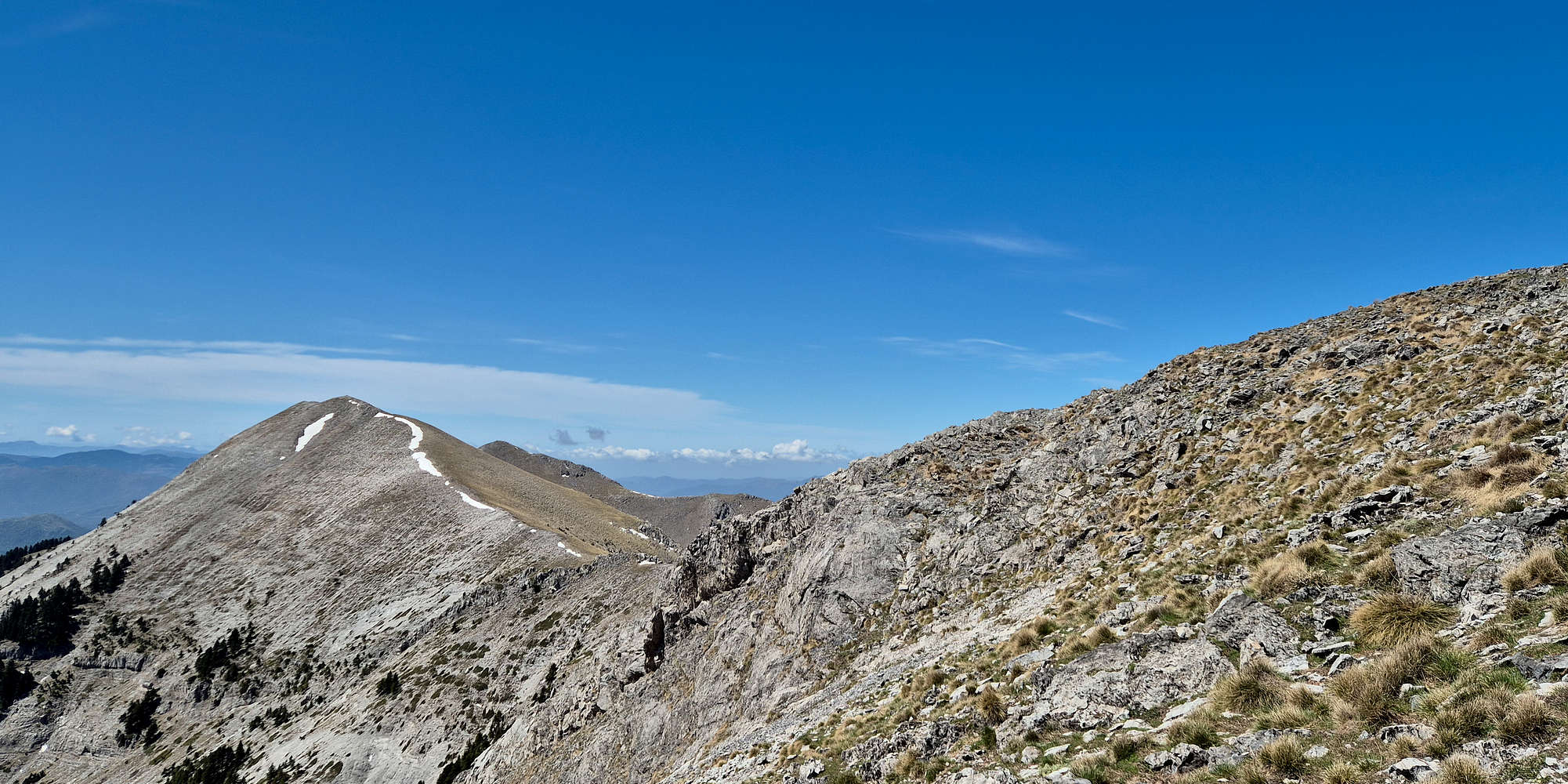 Continuing our ascent we are faced with a classic Peloponnese slope/ridge ascent with no track and just marking as well as a relatively steep grade directly under the noon sun, as at this point it was almost 12:00pm. The slope terrain is however very firm and can be overcome quickly with sufficient fitness and presents no technical challenge. I chose to move mostly on the right, using the ridge for a more airy but still safe experience. Following the sparse cairns we reached the forepeak ~1-2m lower, in roughly 13 minutes, totalling 1:55h from the car, or 1:35h excluding our 20 minute break at the slabs.