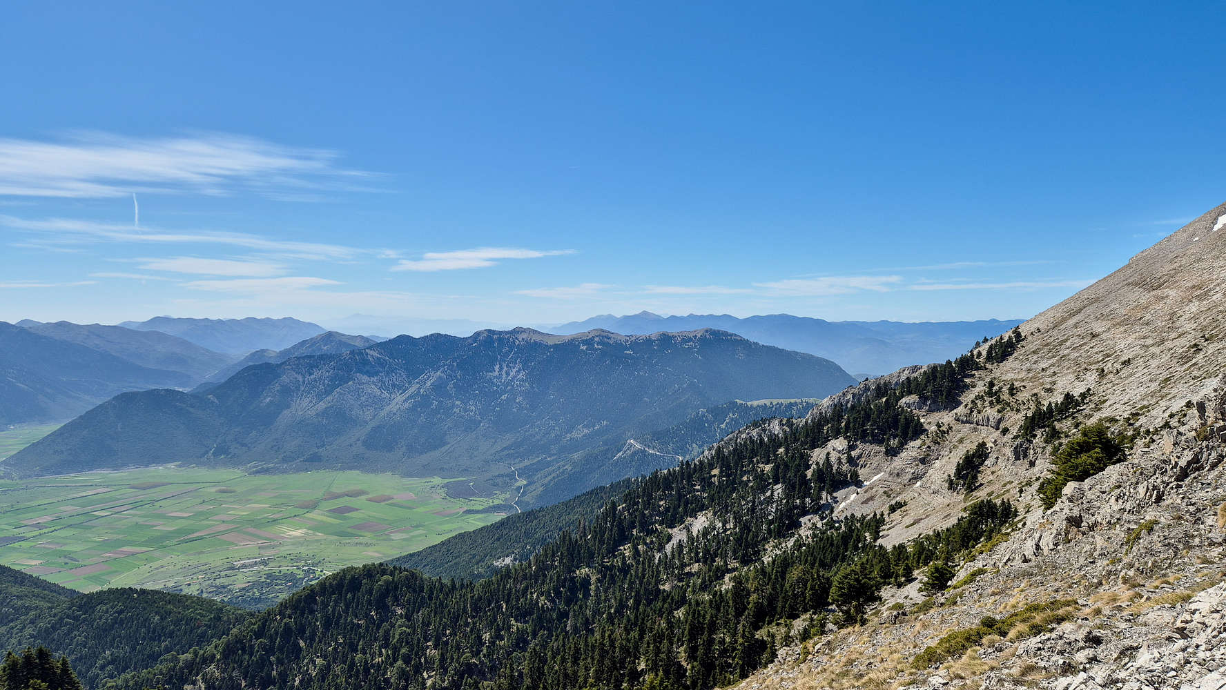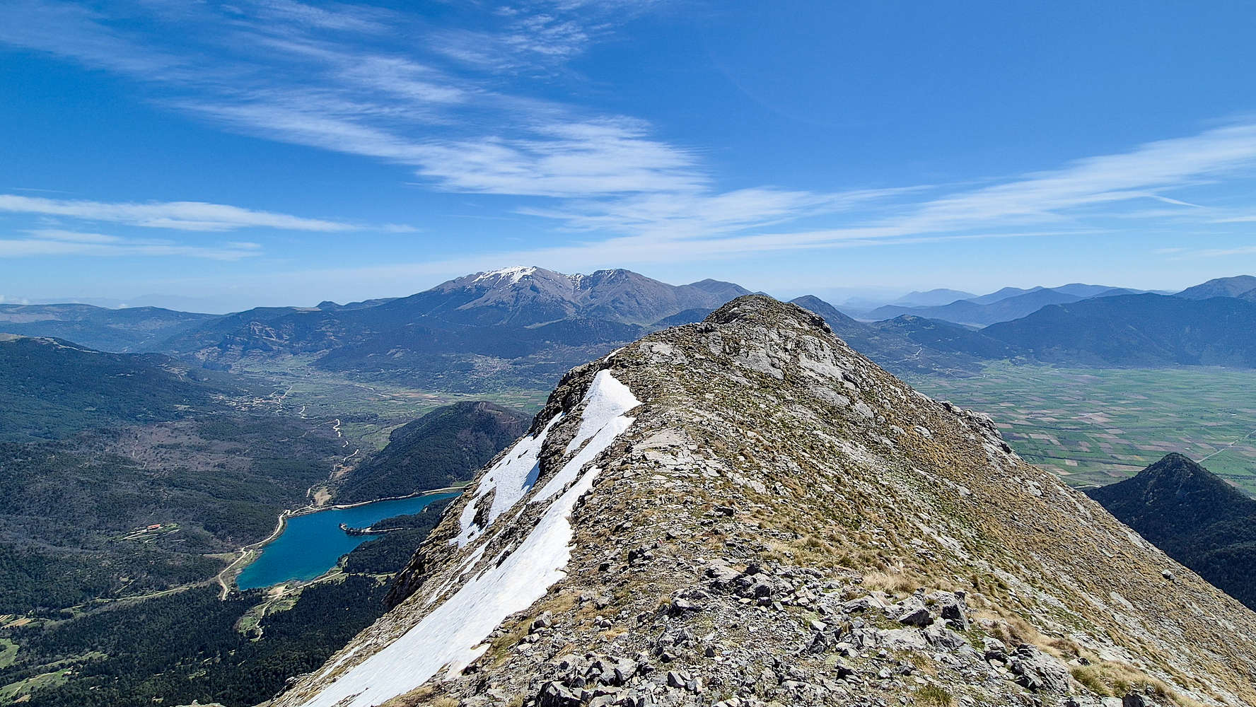 Ntourntouvana [“Ντουρντουβάνα”] (2,107m) or Penteleia Ori [“Πεντέλεια Όρη”] refers to a massif situated at the northwestern edge of Feneos Polje in the borders of Achaia, Corinth, and Arcadia; it is well known for its imposing stature over Doxa Lake. At 2,107m its highest summit is situated further west and is less frequented, although accessible via a spectacular ridge. Popular with hikers, the North summit at 2,090m hangs precariously over the lake and requires an exposed ridge traverse to the final few meters. It is disputed whether Pentelia are an extension of Chelmos (2,355m), and although the geology is - as most places in Greece - similar, the significant prominence and great cultural significance to the residents of Feneos (or Pheneus) makes it somewhat distinct.