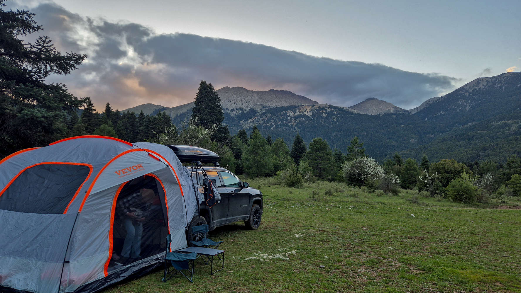 Car camping under Nisi (2,080m) on the shores of Lake Doxa.